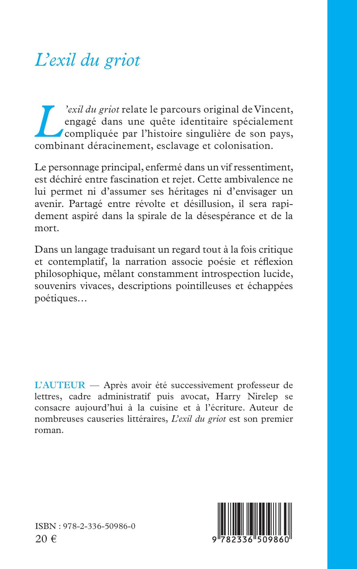 L’exil du griot relate le parcours original de Vincent, engagé dans une quête identitaire spécialement compliquée par l’histoire singulière de son pays, combinant déracinement, esclavage et colonisation.