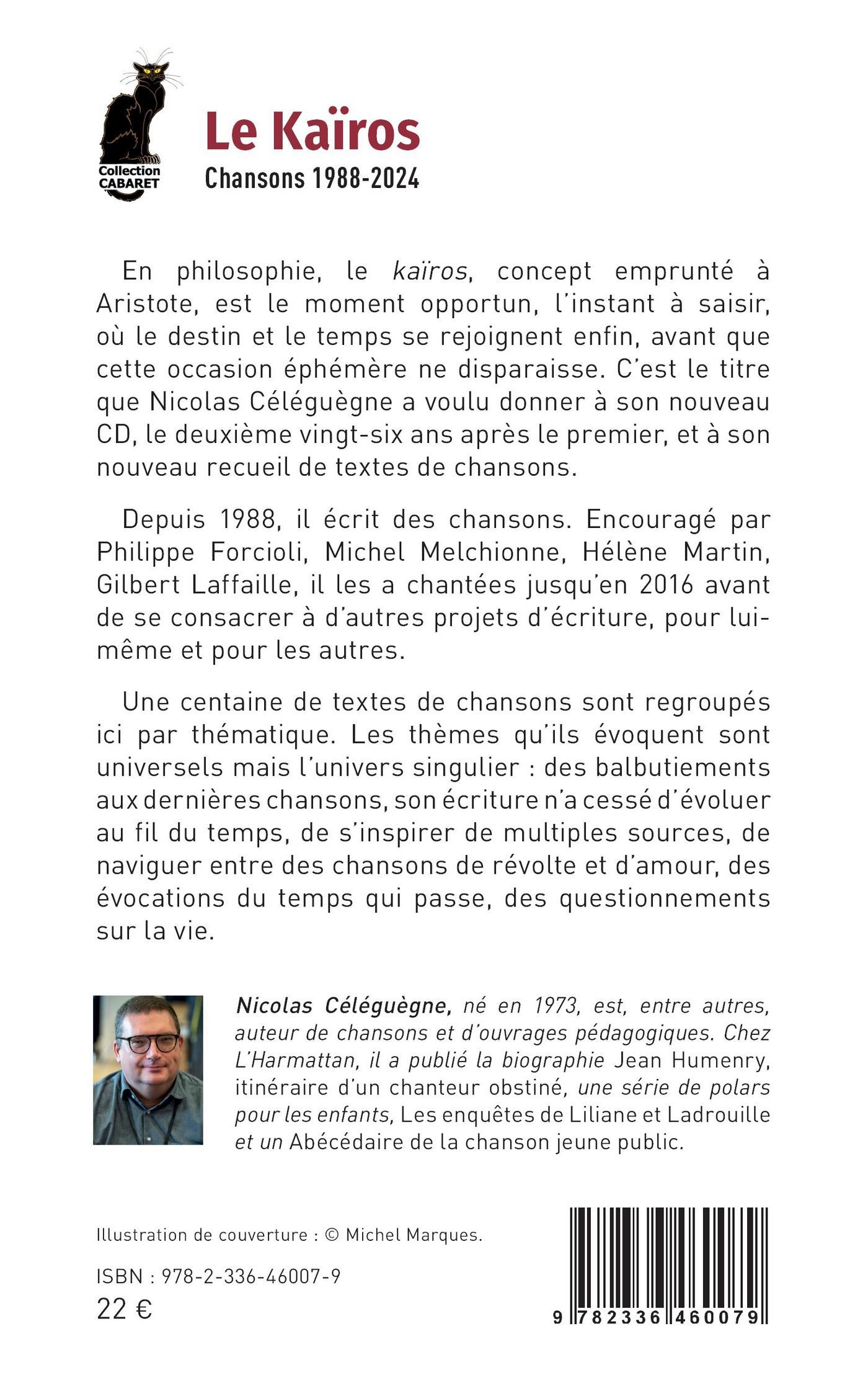 En philosophie, le kaïros, concept emprunté à Aristote, est le moment opportun, l’instant à saisir, où le destin et le temps se rejoignent enfin, avant que cette occasion éphémère ne disparaisse. C’est le titre que Nicolas Céléguègne a voulu donner à son nouveau CD, le deuxième vingt-six ans après le premier, et à son nouveau recueil de textes de chansons.