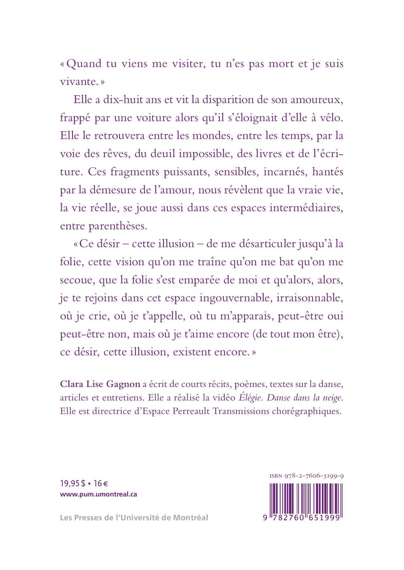 « Quand tu viens me visiter, tu n’es pas mort et je suis vivante. »Elle a dix-huit ans et vit la disparition de son amoureux, frappé par une voiture alors qu’il s’éloignait d’elle à vélo. Elle le retrouvera entre les mondes, entre les temps, par la voie des rêves, du deuil impossible, des livres et de l’écriture. Ces fragments puissants, sensibles, incarnés, hantés par la démesure de l’amour, nous révèlent que la vraie vie, la vie réelle, se joue aussi dans ces espaces intermédiaires, entre parenthèses.« Ce désir – cette illusion – de me désarticuler jusqu’à la folie, cette vision qu’on me traîne qu’on me bat qu’on me secoue, que la folie s’est emparée de moi et qu’alors, alors, je te rejoins dans cet espace ingouvernable, irraisonnable, où je crie, où je t’appelle, où tu m’apparais, peut-être oui peut-être non, mais où je t’aime encore (de tout mon être), ce désir, cette illusion, existent encore. »