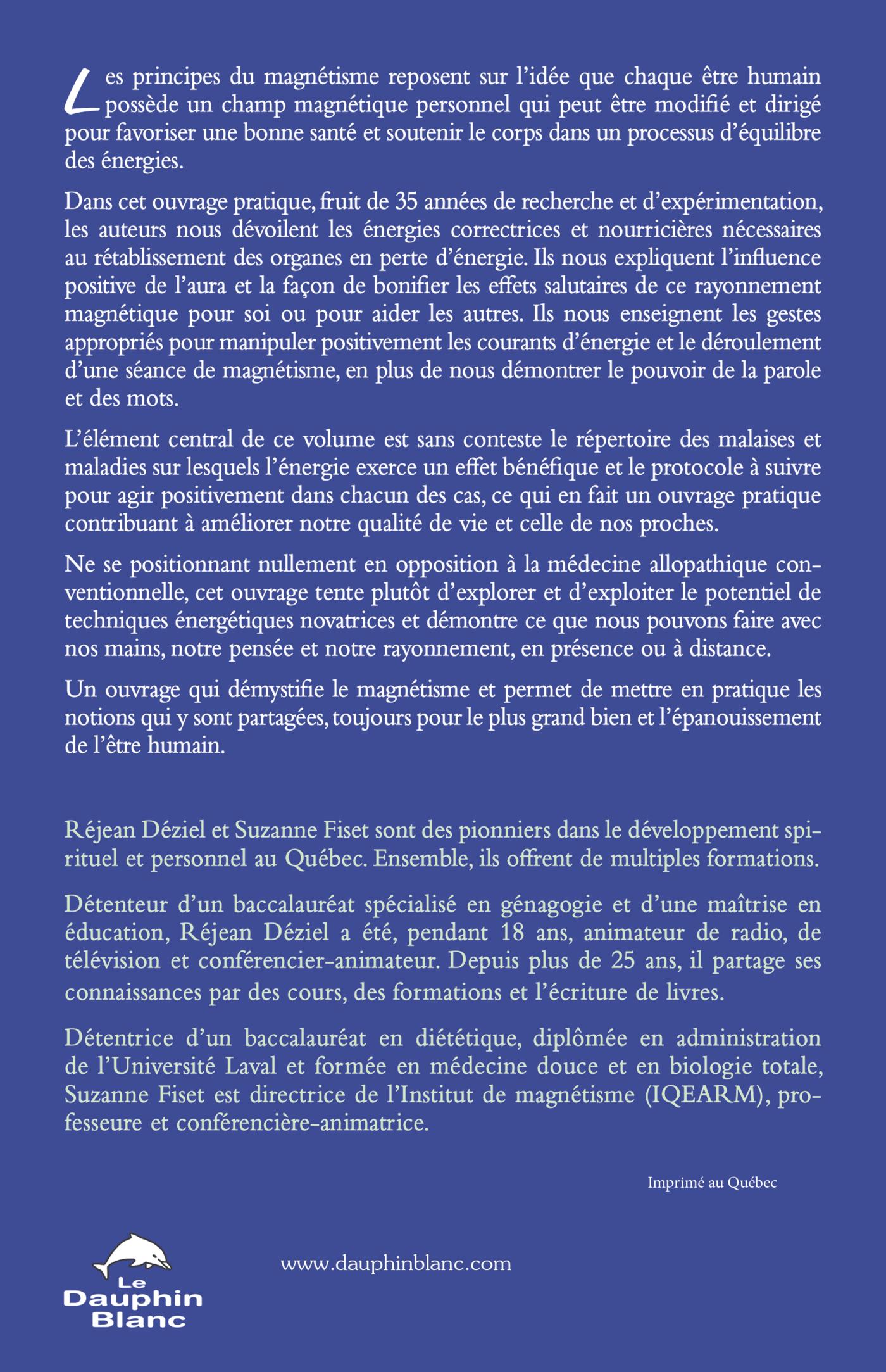 Chaque être humain émet et capte un fluide magnétique. Ce fluide magnétique peut être dirigé par les gestes, la parole et la pensée. Il influence et imprègne le corps humain et les organes qui le composent. Mais comment utiliser ce fluide magnétique à bon escient?Dans cet ouvrage pratique, les auteurs nous dévoilent les 12 grands courants d’énergie à notre disposition. Ils nous expliquent ce qu’est le magnétisme et comment nous pouvons le diriger et le maîtriser pour qu’il soit à notre service. Ils nous parleront donc de l’aura, de l’attitude à adopter, des paroles à prononcer, des pensées à entretenir mais aussi des techniques d’imposition des mains et de manipulation des énergies, des moyens de protection tant sur les plans physique et intellectuel que psychique et spirituel, et du développement de notre pouvoir de guérison.En deuxième partie du livre, les auteurs expliquent comment agir positivement sur quelques malaises et les maladies à partir des 12 courants d’énergie. Un ouvrage qui démystifie le magnétisme et qui permet de mettre en pratique les notions qui y sont partagées, toujours pour le plus grand bien et l’épanouissement de l’être humain.Les auteurs :Réjean Déziel et Suzanne Fiset sont des pionniers dans le développement spirituel et personnel au Québec. Ensemble, ils ont fondé l’École Réjean Déziel où ils ont offert de multiples formations. Détenteur d’un baccalauréat spécialisé en génagogie et d’une maîtrise en éducation, Réjean Déziel a été, pendant 18 ans, animateur de radio, de télévision et conférencier-animateur. Il a été pendant 25 ans professeur et président directeur de l’École Réjean Déziel. Détentrice d’un baccalauréat en diététique, diplômée en administration de l’Université Laval et formée en médecine douce et en biologie totale, Suzanne Fiset a été responsable de l’École Réjean Déziel, est directrice de l’Institut de magnétisme (IQEARM), professeure et conférencière-animatrice.