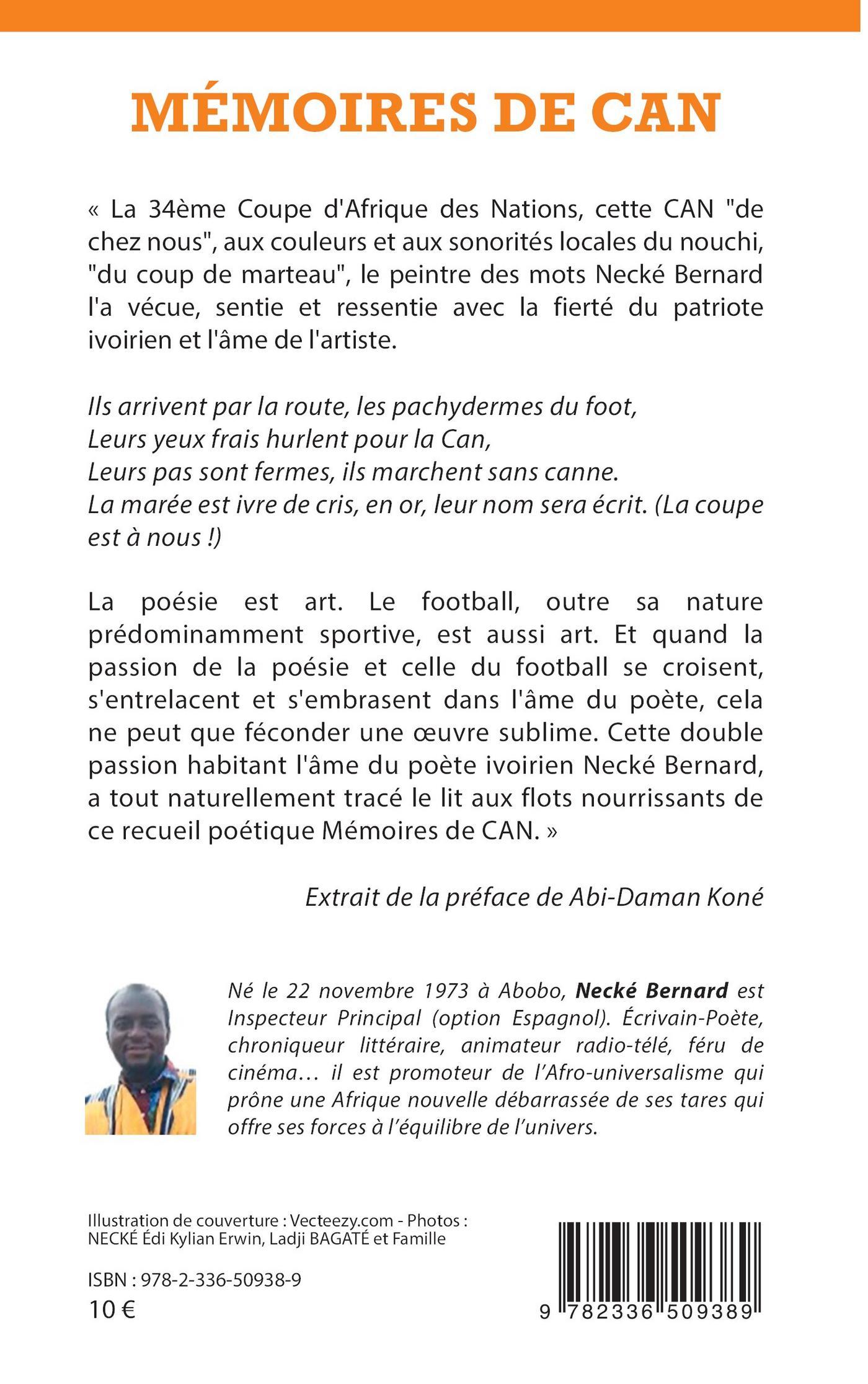 La poésie est art. Le football, outre sa nature prédominamment sportive, est aussi art. Et quand la passion de la poésie et celle du football se croisent, s'entrelacent et s'embrasent dans l'âme du poète, cela ne peut que féconder une œuvre sublime. Cette double passion habitant l'âme du poète ivoirien Necké Bernard, a tout naturellement tracé le lit aux flots nourrissants de ce recueil poétique Mémoires de CAN. » (Extrait de la Préface de Abi-Daman Koné).