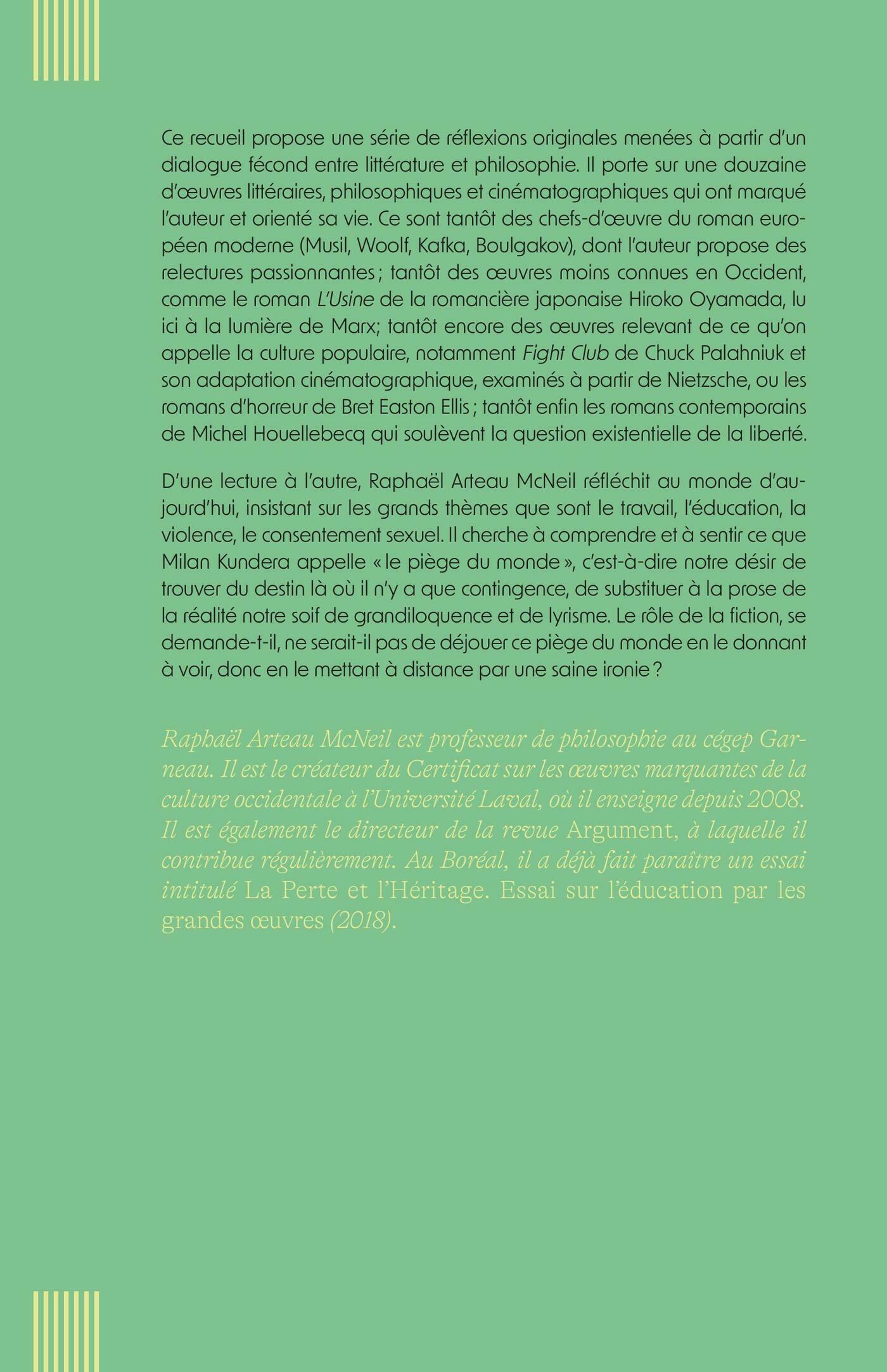 D’une lecture à l’autre, Raphaël Arteau-McNeil réfléchit au monde d’aujourd’hui, insistant sur les grands thèmes que sont le travail, l’éducation, la violence, le consentement sexuel. Il cherche à comprendre et à sentir ce que Milan Kundera appelle « le piège du monde », c’est-à-dire notre désir de trouver du destin là où il n’y a que contingence, de substituer à la prose de la réalité notre soif de grandiloquence et de lyrisme. Le rôle de la fiction, se demande-t-il, ne serait-il pas de déjouer ce piège du monde en le donnant à voir, donc en le mettant à distance par une saine ironie ? Telle est l’interrogation qui sert de fil conducteur aux lectures toujours éclairantes que Raphaël Arteau-McNeil propose dans ce livre, qui se clôt par un hommage à l’art de l’essai et à François Ricard.