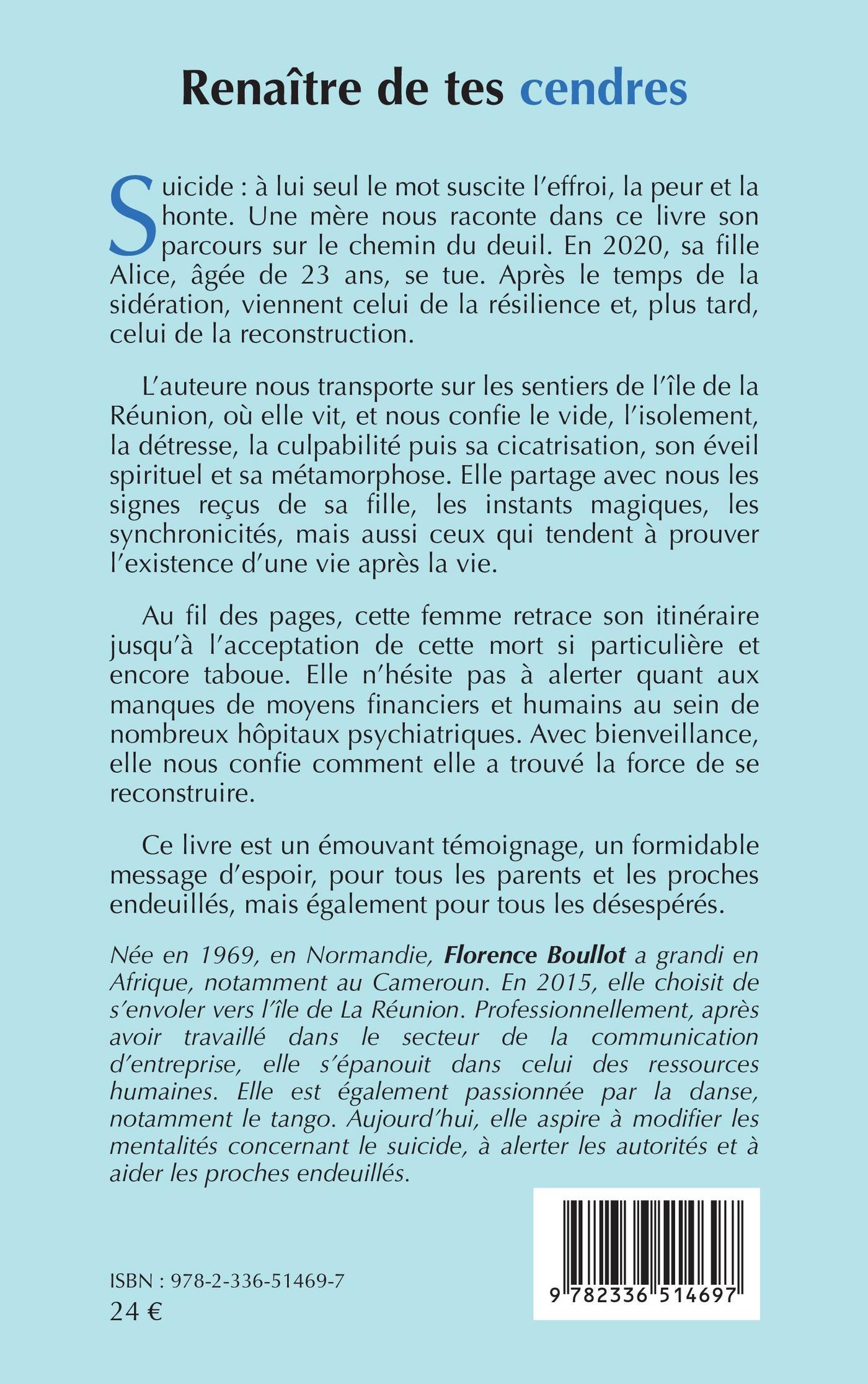 Au fil des pages, cette femme retrace son itinéraire jusqu’à l’acceptation de cette mort si particulière et encore taboue. Elle n’hésite pas à alerter quant aux manques de moyens financiers et humains au sein de nombreux hôpitaux psychiatriques. Avec bienveillance, elle nous confie comment elle a trouvé la force de se reconstruire.