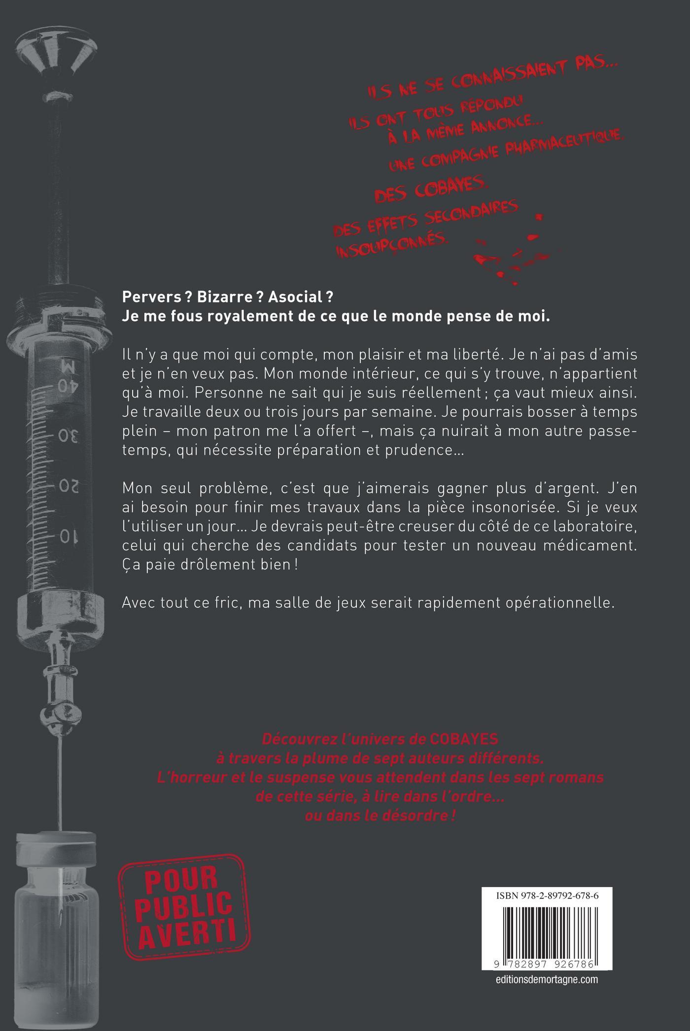 Ils ne se connaissaient pas… Ils sont tous répondu à la même annonce…Une compagnie pharmaceutique. Des cobayes. Des effets secondaires insoupçonnés.Pervers ? Bizarre ? Asocial ? Je me fous royalement de ce que le monde pense de moi.Il n’y a que moi qui compte, mon plaisir et ma liberté. Je n’ai pas d’amis et je n’en veux pas. Mon monde intérieur, ce qui s’y trouve, n’appartient qu’à moi. Personne ne sait qui je suis réellement ; ça vaut mieux ainsi. Je travaille deux ou trois jours par semaine. Je pourrais bosser à temps plein – mon patron me l’a offert –, mais ça nuirait à mon autre passetemps, qui nécessite préparation et prudence…Mon seul problème, c’est que j’aimerais gagner plus d’argent. J’en ai besoin pour finir mes travaux dans la pièce insonorisée. Si je veux l’utiliser un jour… Je devrais peut-être creuser du côté de ce laboratoire, celui qui cherche des candidats pour tester un nouveau médicament. Ça paie drôlement bien !Avec tout ce fric, ma salle de jeux serait rapidement opérationnelle.Découvrez l’univers de COBAYES à travers la plume de sept auteurs différents. L’horreur et le suspense vous attendent dans les sept romans de cette série, à lire dans l’ordre… ou dans le désordre !