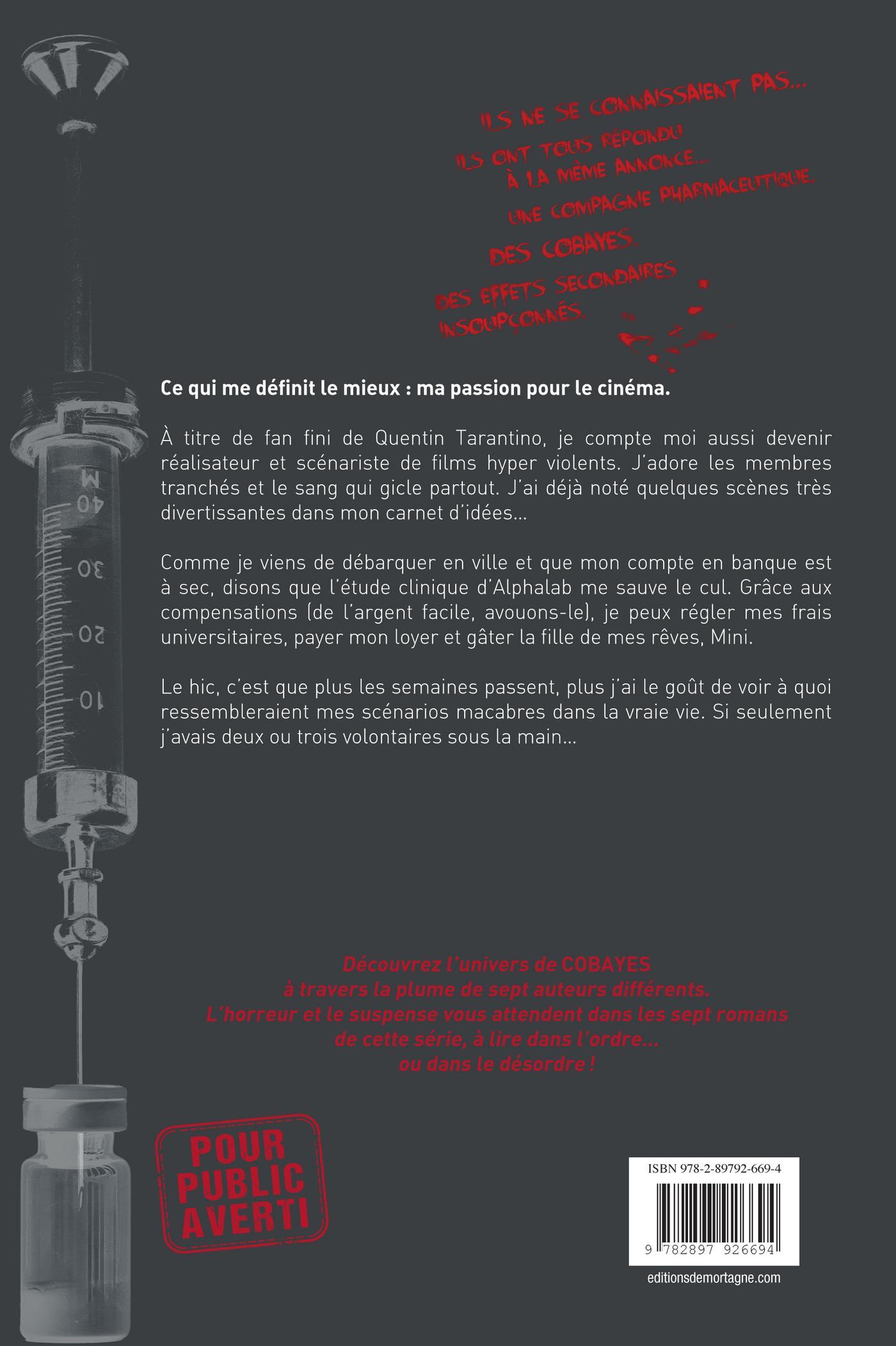 Ils ne se connaissaient pas… Ils sont tous répondu à la même annonce…Une compagnie pharmaceutique. Des cobayes. Des effets secondaires insoupçonnés.Ce qui me définit le mieux : ma passion pour le cinéma.À titre de fan fini de Quentin Tarantino, je compte moi aussi devenir réalisateur et scénariste de films hyper violents. J’adore les membres tranchés et le sang qui gicle partout. J’ai déjà noté quelques scènes très divertissantes dans mon carnet d’idées…Comme je viens de débarquer en ville et que mon compte en banque est à sec, disons que l’étude clinique d’Alphalab me sauve le cul. Grâce aux compensations (de l’argent facile, avouons-le), je peux régler mes frais universitaires, payer mon loyer et gâter la fille de mes rêves, Mini.Le hic, c’est que plus les semaines passent, plus j’ai le goût de voir à quoi ressembleraient mes scénarios macabres dans la vraie vie. Si seulement j’avais deux ou trois volontaires sous la main…Découvrez l’univers de COBAYES à travers la plume de sept auteurs différents. L’horreur et le suspense vous attendent dans les sept romans de cette série, à lire dans l’ordre… ou dans le désordre !