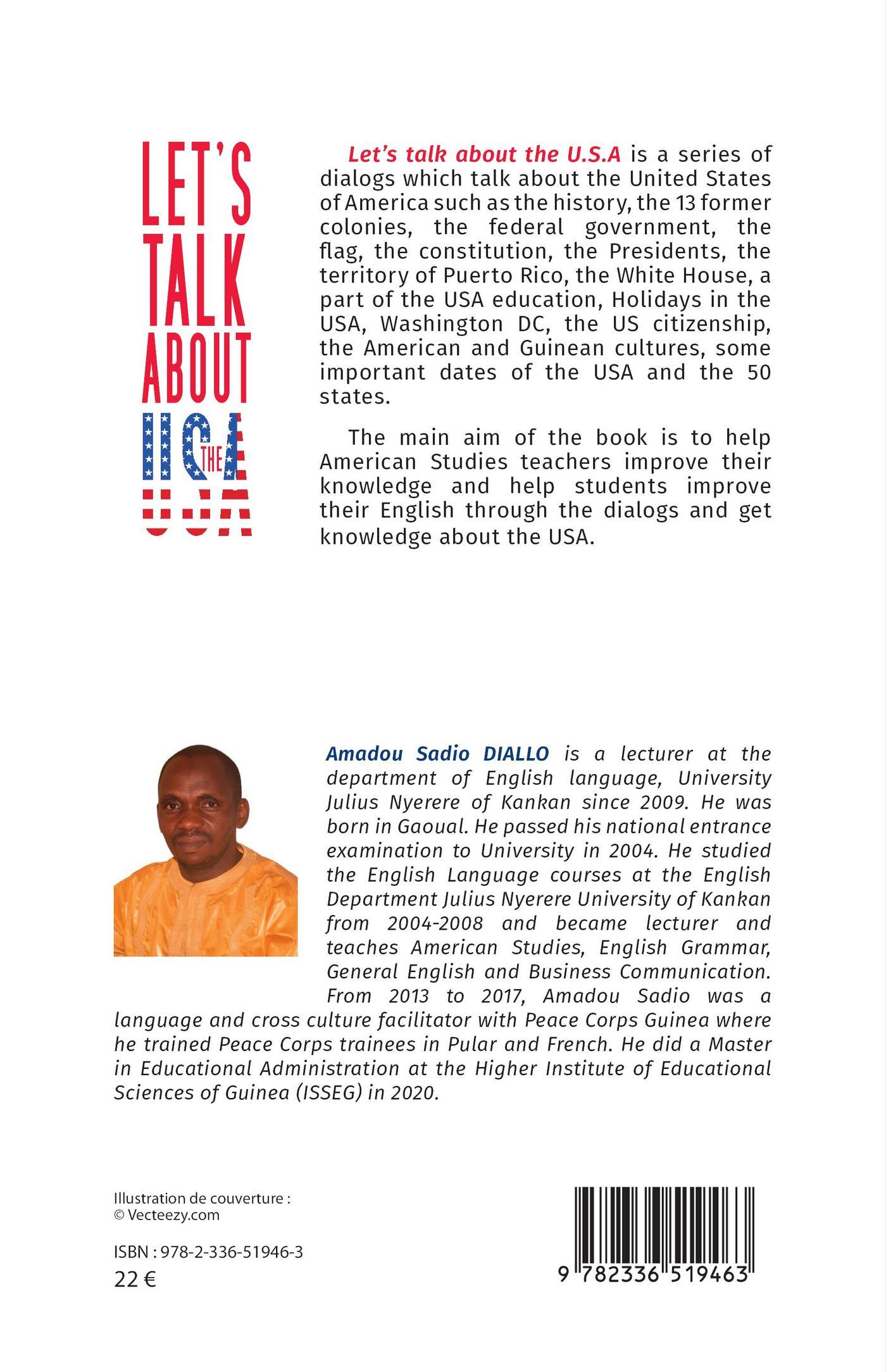 Let’s talk about the U.S.A is a series of dialogs which talk about the United States of America such as the history, the 13 former colonies, the federal government, the fl ag, the constitution, the Presidents, the territory of Puerto Rico, the White House, a part of the USA education, Holidays in the USA, Washington DC, the US citizenship, the American and Guinean cultures, some important dates of the USA and the 50 states.