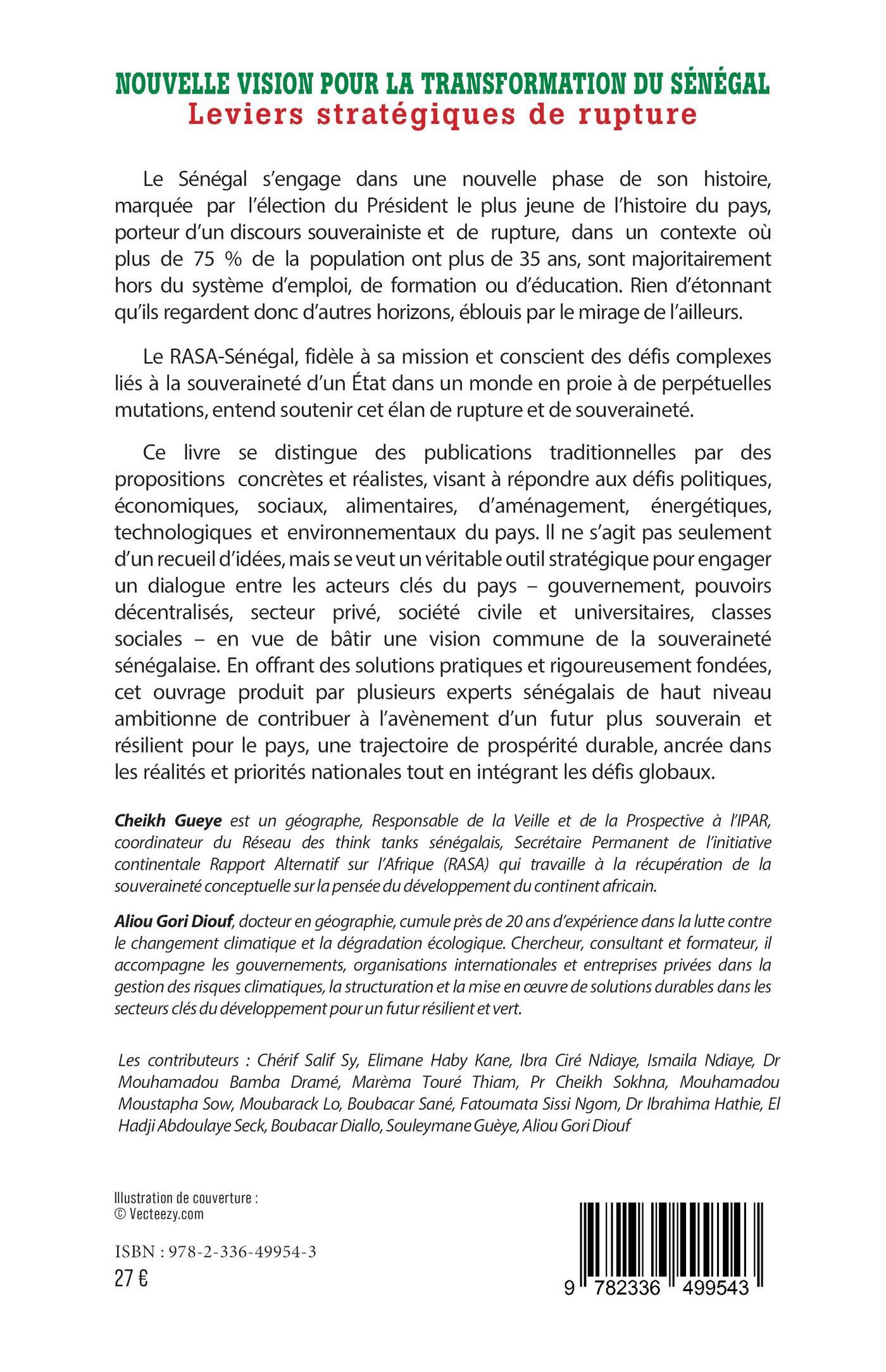 Ce livre se distingue des publications traditionnelles par des propositions concrètes et réalistes, visant à répondre aux défis politiques, économiques, sociaux, alimentaires, d’aménagement, énergétiques, technologiques et environnementaux du pays. Il ne s’agit pas seulement d’un recueil d’idées, mais se veut un véritable outil stratégique pour engager un dialogue entre les acteurs clés du pays – gouvernement, pouvoirs décentralisés, secteur privé, société civile et universitaires, classes sociales – en vue de bâtir une vision commune de la souveraineté sénégalaise. En offrant des solutions pratiques et rigoureusement fondées, cet ouvrage produit par plusieurs experts sénégalais de haut niveau ambitionne de contribuer à l’avènement d’un futur plus souverain et résilient pour le pays, une trajectoire de prospérité durable, ancrée dans les réalités et priorités nationales tout en intégrant les défis globaux.