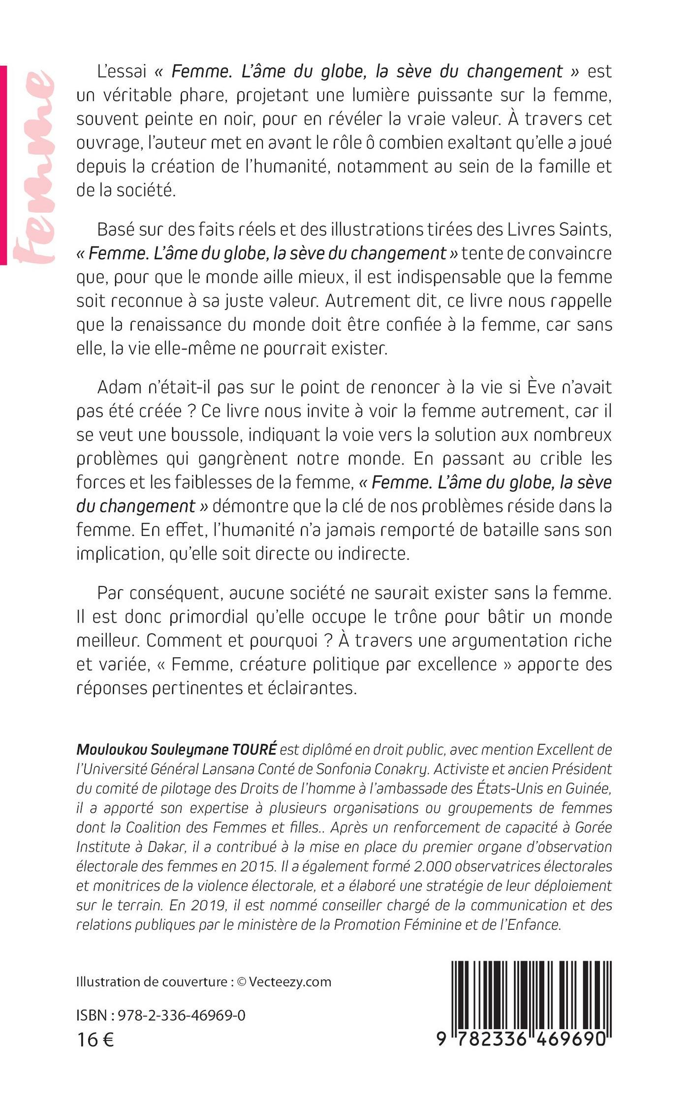 Basé sur des faits réels et des illustrations tirées des Livres Saints, l'ouvrage tente de convaincre que, pour que le monde aille mieux, il est indispensable que la femme soit reconnue à sa juste valeur. Autrement dit, ce livre nous rappelle que la renaissance du monde doit être confiée à la femme, car sans elle, la vie elle-même ne pourrait exister. Il nous invite à voir la femme autrement, car il se veut une boussole, indiquant la voie vers la solution aux nombreux problèmes qui gangrènent notre monde. En passant au crible les forces et les faiblesses de la femme, « Femme. L’âme du globe, la sève du changement » démontre que la clé de nos problèmes réside dans la femme. En effet, l’humanité n’a jamais remporté de bataille sans son implication, qu’elle soit directe ou indirecte. Il est donc primordial qu’elle occupe le trône pour bâtir un monde meilleur. Comment et pourquoi ? À travers une argumentation riche et variée, ce livre apporte des réponses pertinentes et éclairantes.