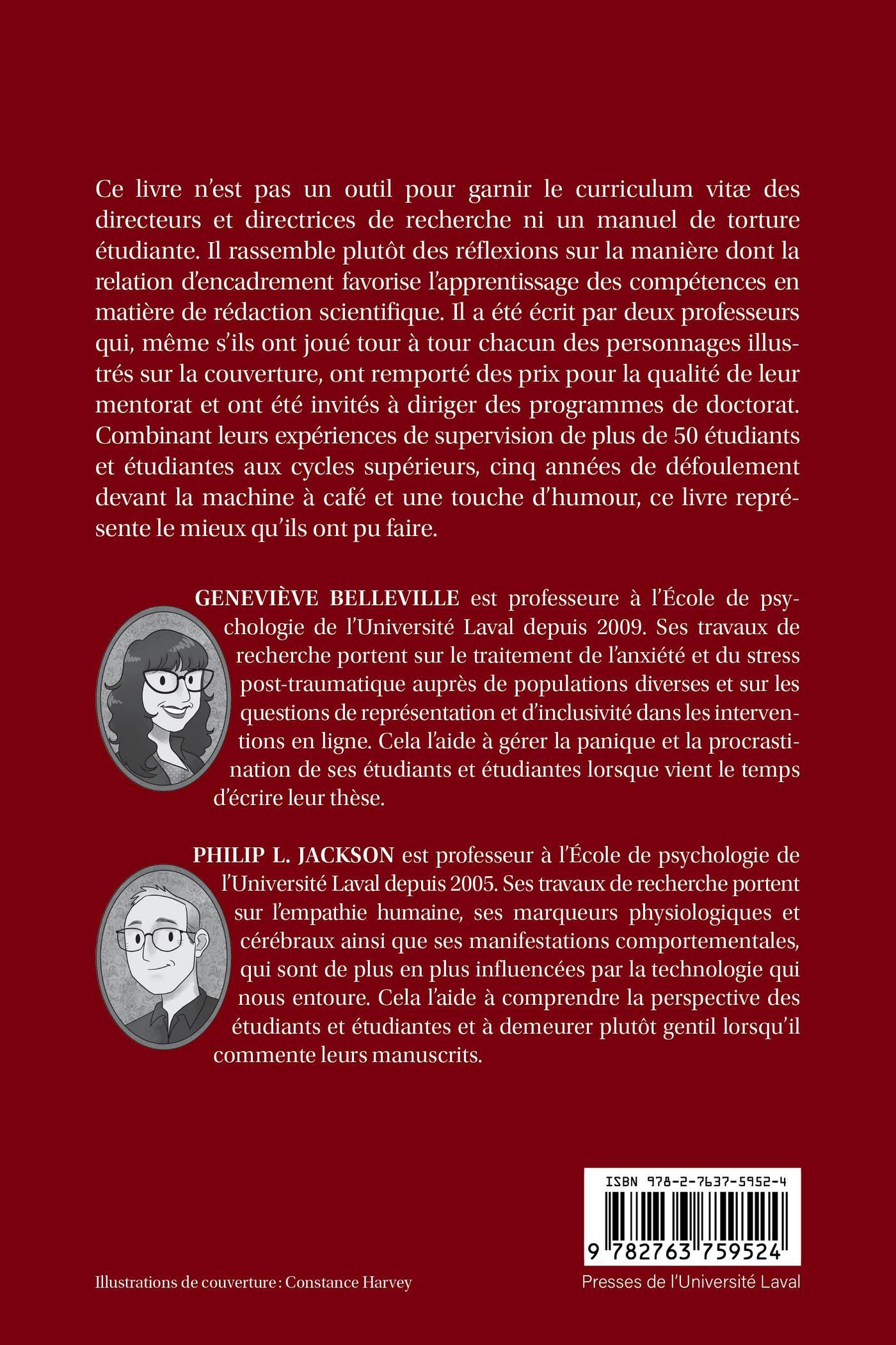 Ce livre n’est pas un outil pour garnir le curriculum vitæ des directeurs et directrices de recherche ni un manuel de torture étudiante. Il rassemble plutôt des réflexions sur la manière dont la relation d’encadrement favorise l’apprentissage des compétences en matière de rédaction scientifique. Il a été écrit par deux professeurs qui, même s’ils ont joué tour à tour chacun des personnages illustrés sur la couverture, ont remporté des prix pour la qualité de leur mentorat et ont été invités à diriger des programmes de doctorat. Combinant leurs expériences de supervision de plus de 50 étudiants et étudiantes aux cycles supérieurs, cinq années de défoulement devant la machine à café et une touche d’humour, ce livre représente le mieux qu’ils ont pu faire.