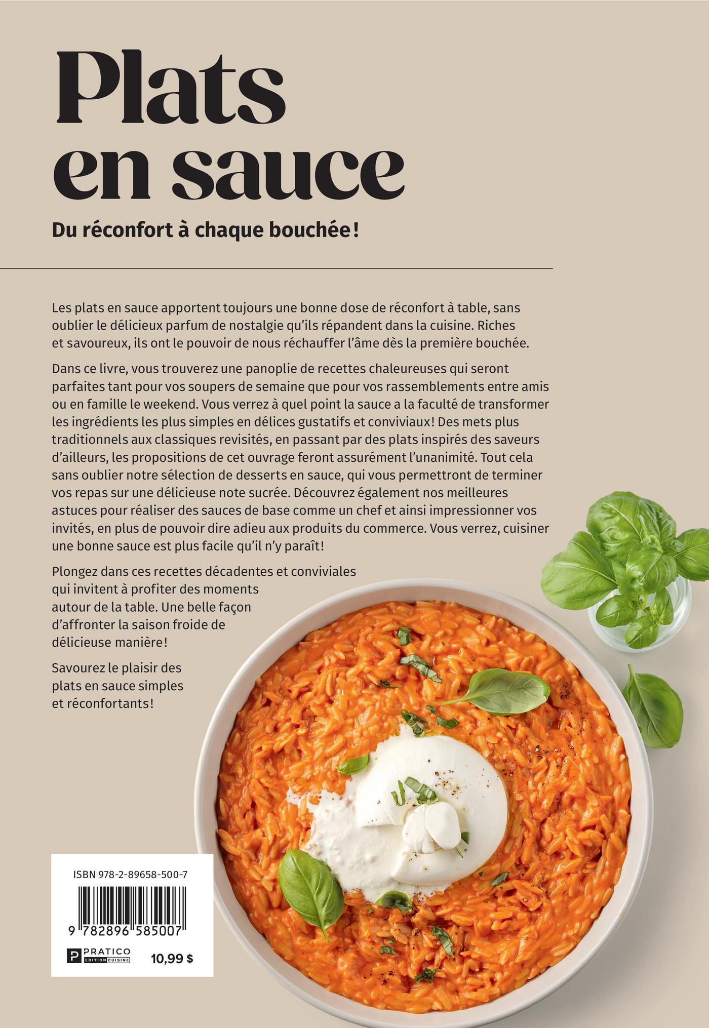 Les plats en sauce apportent toujours une bonne dose de réconfort à table, sans oublier le délicieux parfum de nostalgie qu’ils répandent dans la cuisine. Riches et savoureux, ils ont le pouvoir de nous réchauffer l’âme dès la première bouchée. Dans ce livre, vous trouverez une panoplie de recettes chaleureuses qui seront parfaites tant pour vos soupers de semaine que pour vos rassemblements entre amis ou en famille le weekend. Vous verrez à quel point la sauce a la faculté de transformer les ingrédients les plus simples en délices gustatifs et conviviaux ! Des mets plus traditionnels aux classiques revisités, en passant par des plats inspirés des saveurs d’ailleurs, les propositions de cet ouvrage feront assurément l’unanimité. Tout cela sans oublier notre sélection de desserts en sauce, qui vous permettront de terminer vos repas sur une délicieuse note sucrée. Découvrez également nos meilleures astuces pour réaliser des sauces de base comme un chef et ainsi impressionner vos invités, en plus de pouvoir dire adieu aux produits du commerce. Vous verrez, cuisiner une bonne sauce est plus facile qu’il n’y paraît ! Plongez dans ces recettes décadentes et conviviales qui invitent à profiter des moments autour de la table. Une belle façon d’affronter la saison froide de délicieuse manière ! Savourez le plaisir des plats en sauce simples et réconfortants !