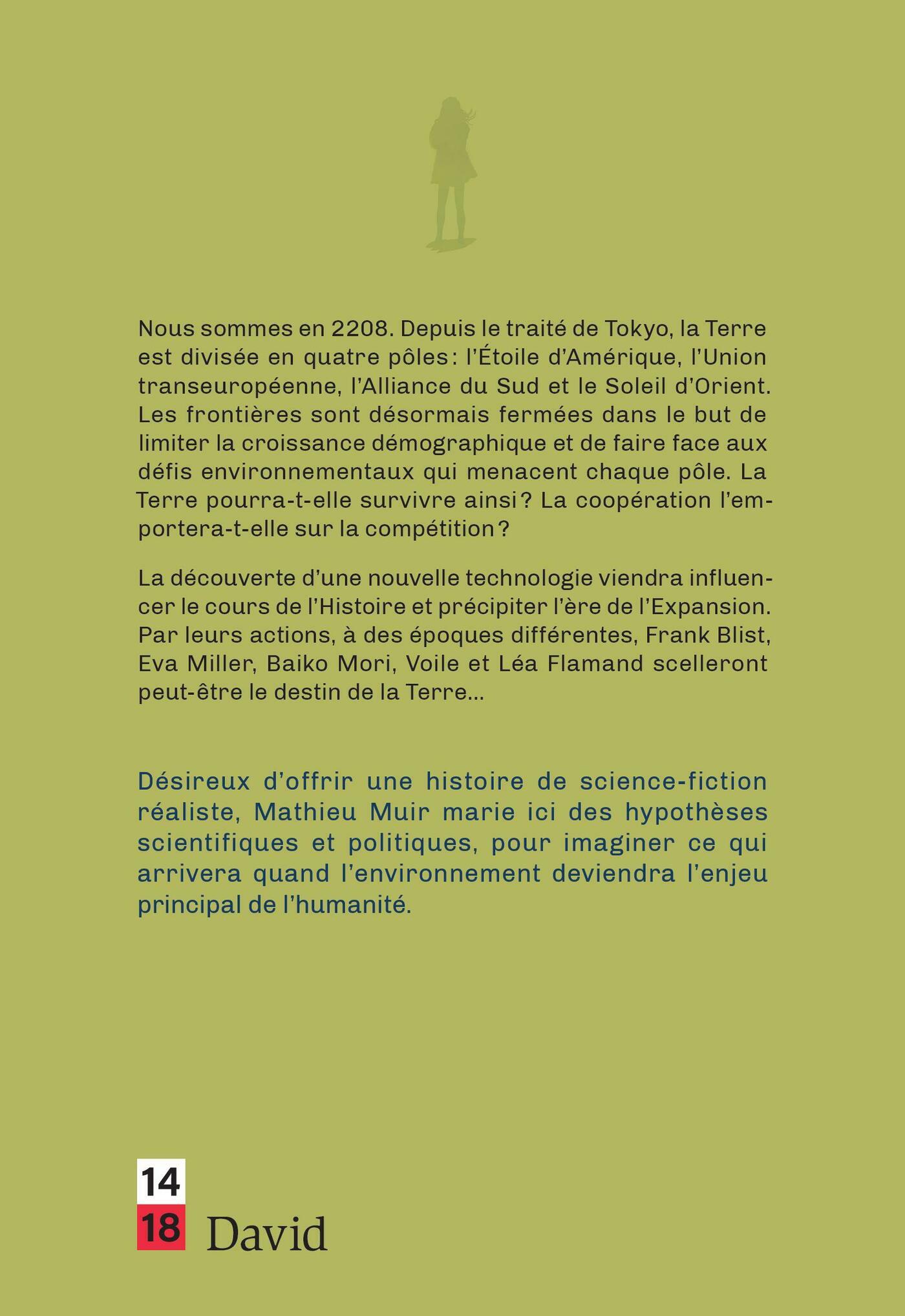 Nous sommes en 2208. Depuis le traité de Tokyo, la Terre est divisée en quatre pôles : l’Étoile d’Amérique, l’Union transeuropéenne, l’Alliance du Sud et le Soleil d’Orient. Les frontières sont désormais fermées dans le but de limiter la croissance démographique et de faire face aux défis environnementaux qui menacent chaque pôle. La Terre pourra-t-elle survivre ainsi ? La coopération l’emportera-t-elle sur la compétition ?La découverte d’une nouvelle technologie viendra influencer le cours de l’Histoire et précipiter l’ère de l’Expansion. Par leurs actions, à des époques différentes, Frank Blist, Eva Miller, Baiko Mori, Voile et Léa Flamand scelleront peut-être le destin de la Terre…Désireux d’offrir une histoire de science-fiction réaliste, Mathieu Muir marie ici des hypothèses scientifiques et politiques, pour imaginer ce qui arrivera quand l’environnement deviendra l’enjeu principal de l’humanité.