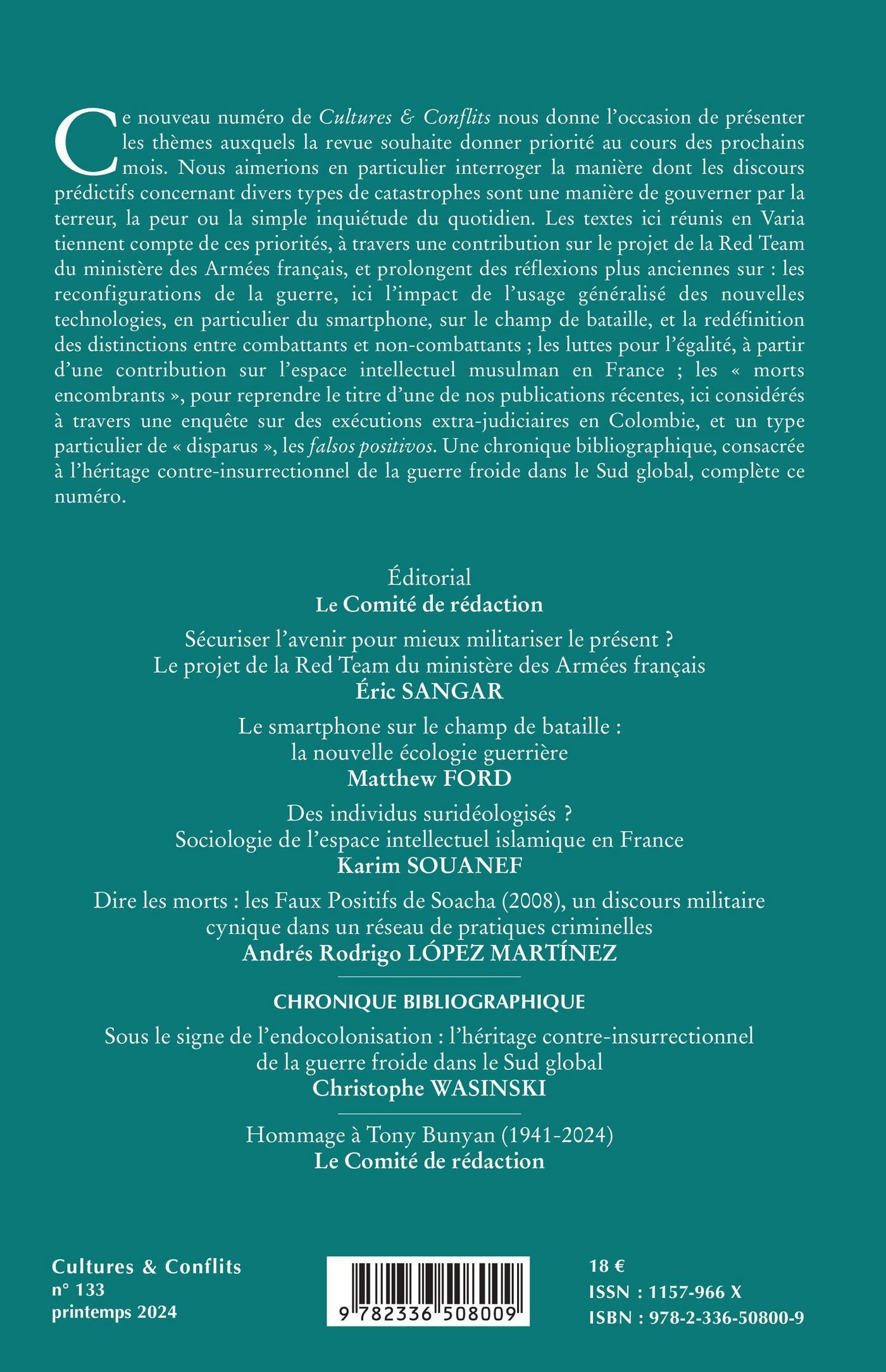 Ce nouveau numéro de Cultures & Conflits nous donne l’occasion de présenter les thèmes auxquels la revue souhaite donner priorité au cours des prochains mois. Nous aimerions en particulier interroger la manière dont les discours prédictifs concernant divers types de catastrophes sont une manière de gouverner par la terreur, la peur ou la simple inquiétude du quotidien. Les textes ici réunis en Varia tiennent compte de ces priorités, à travers une contribution sur le projet de la Red Team du ministère des Armées français, et prolongent des réflexions plus anciennes sur : les reconfigurations de la guerre, ici l’impact de l’usage généralisé des nouvelles technologies, en particulier du smartphone, sur le champ de bataille, et la redéfinition des distinctions entre combattants et non-combattants ; les luttes pour l’égalité, à partir d’une contribution sur l’espace intellectuel musulman en France ; les « morts encombrants », pour reprendre le titre d’une de nos publications récentes, ici considérés à travers une enquête sur des exécutions extra-judiciaires en Colombie, et un type particulier de « disparus », les falsos positivos. Une chronique bibliographique, consacrée à l’héritage contre-insurrectionnel de la guerre froide dans le Sud global, complète ce numéro.
