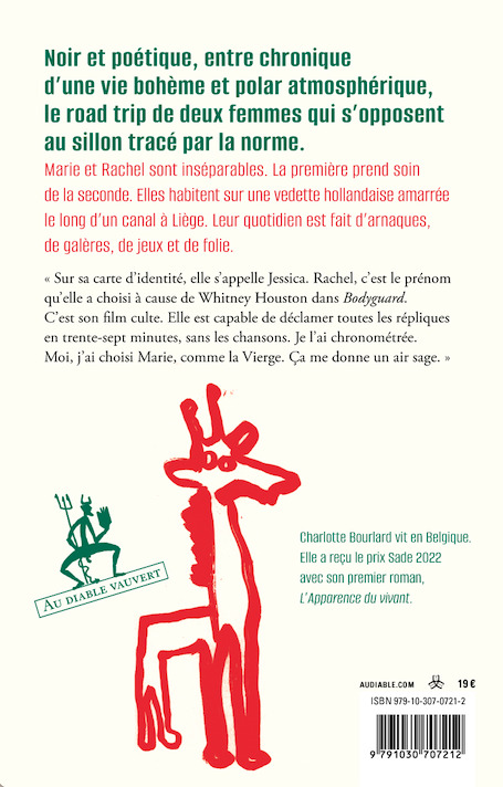 Noir et poétique, entre chronique d'une vie bohème et polar atmosphérique, le road trip de deux femmes qui s'opposent au sillon tracé par la norme.Marie et Rachel sont inséparables. La première prend soin de la seconde. Elles habitent sur une vedette hollandaise amarrée le long d'un canal à Liège. Leur quotidien est fait d'arnaques, de galères, de jeux et de folie. Sur sa carte d'identité, elle s'appelle Jessica. Rachel, c'est le prénom qu'elle a choisi à cause de Whitney Houston dans Bodyguard.C'est son film culte. Elle est capable de déclamer toutes les répliques en trente-sept minutes, sans les chansons. Je l'ai chronométrée.Moi, j'ai choisi Marie, comme la Vierge. Ça me donne un air sage.
