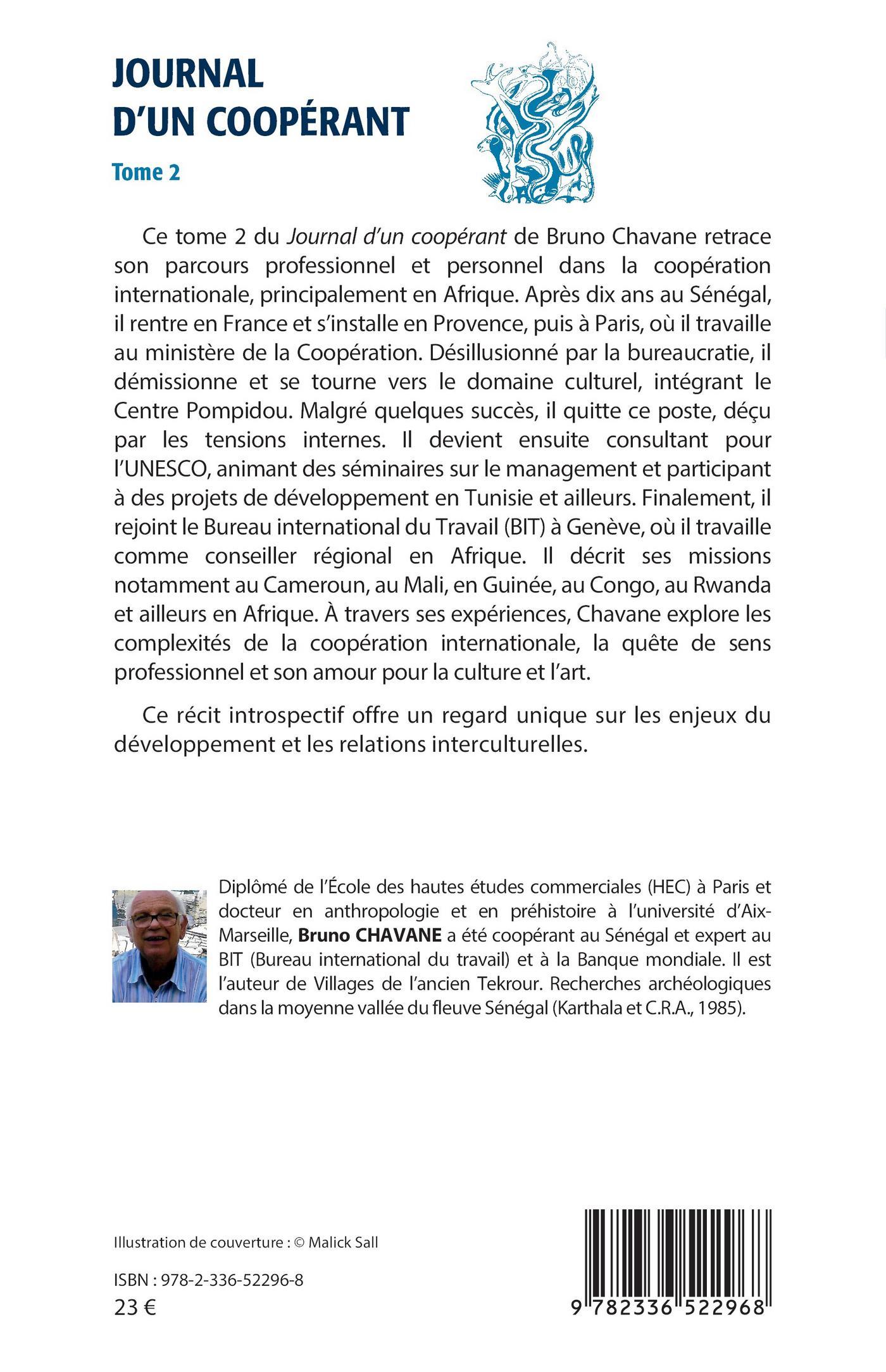 Ce tome 2 du Journal d’un coopérant de Bruno Chavane retrace son parcours professionnel et personnel dans la coopération internationale, principalement en Afrique. Après dix ans au Sénégal, il rentre en France et s’installe en Provence, puis à Paris, où il travaille au ministère de la Coopération. Désillusionné par la bureaucratie, il démissionne et se tourne vers le domaine culturel, intégrant le Centre Pompidou. Malgré quelques succès, il quitte ce poste, déçu par les tensions internes. Il devient ensuite consultant pour l’UNESCO, animant des séminaires sur le management et participant à des projets de développement en Tunisie et ailleurs. Finalement, il rejoint le Bureau international du Travail (BIT) à Genève, où il travaille comme conseiller régional en Afrique. Il décrit ses missions notamment au Cameroun, au Mali, en Guinée, au Congo, au Rwanda et ailleurs en Afrique. À travers ses expériences, Chavane explore les complexités de la coopération internationale, la quête de sens professionnel et son amour pour la culture et l’art.
