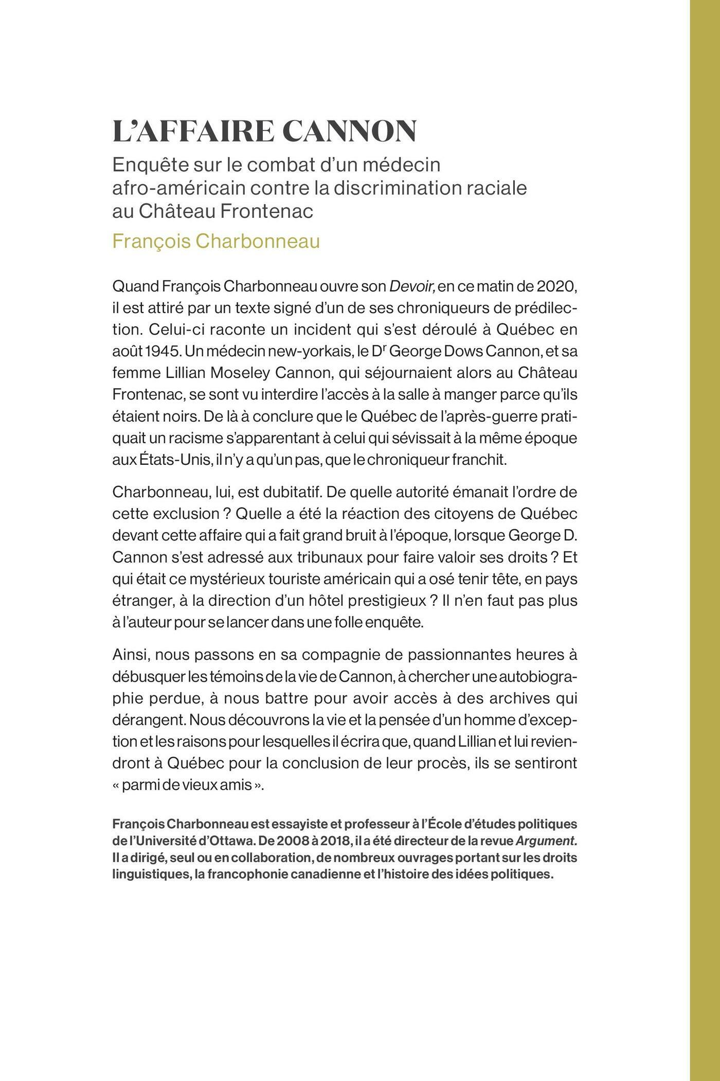 Quand François Charbonneau ouvre son Devoir, par un matin de 2020, il est attiré par un texte signé d’un de ses chroniqueurs de prédilection, qui est aussi historien. Celui-ci raconte un incident qui s’est déroulé à Québec en août 1945. Un médecin new-yorkais, le docteur George D. Cannon, qui séjournait alors au Château Frontenac avec sa femme Lillian Moseley Cannon, s’est vu interdire l’accès à la salle à manger. Même si cela n’était pas explicitement formulé, ce refus tenait de toute évidence à leur couleur de peau. De là à conclure que le Québec de l’immédiat après-guerre pratiquait un racisme s’apparentant à celui qui sévissait à la même époque aux États-Unis, il n’y avait qu’un pas, pas que le chroniqueur-historien franchissait allègrement.