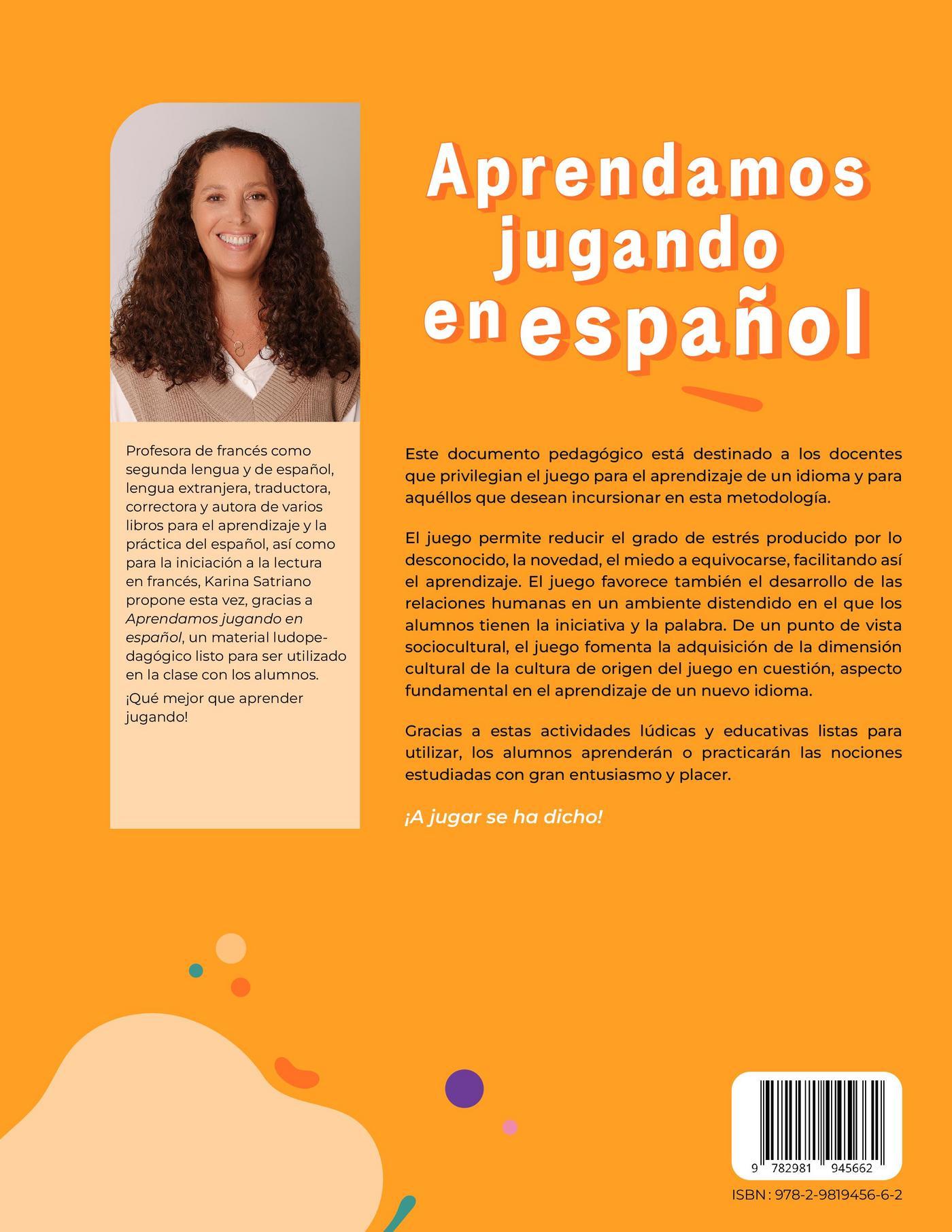 Ce document, qui se veut un outil didactique, est destiné aux enseignantes et enseignants qui privilégient le jeu pour l’apprentissage de l’espagnol langue étrangère autant au primaire, au secondaire et avec des adultes ainsi qu'à ceux qui aimeraient explorer cette méthodologie.Le jeu permet de réduire le stress produitpar l’inconnu, la nouveauté, la peur de se tromper, ce qui facilite l’apprentissage. Le jeu favorise également le développement des relations humaines dans une ambiance détendue où l’initiative et la parole reviennent aux apprenants.Sur le plan socioculturel, il est également important de signaler le fait que le jeu permet à l’apprenant de s’approprier la dimension culturelle de la culture de provenance du jeu en question, ce qui est fondamental dans l’apprentissage d’une nouvelle langue.Bref, c'est grâce à ces activités ludiques et éducatives prêtes à être utilisées que les élèves apprendront ou pratiqueront les notions étudiées en classe avec grand enthousiasme et plaisir.