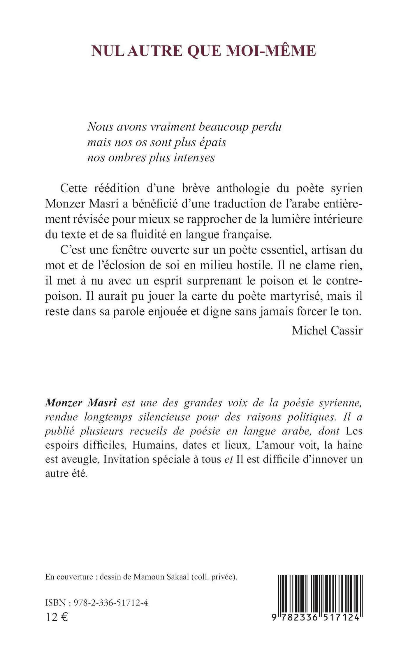 Cette réédition d’une brève anthologie du poète syrien Monzer Masri a bénéficié d’une traduction de l’arabe entièrement révisée pour mieux se rapprocher de la lumière intérieure du texte et de sa fluidité en langue française.