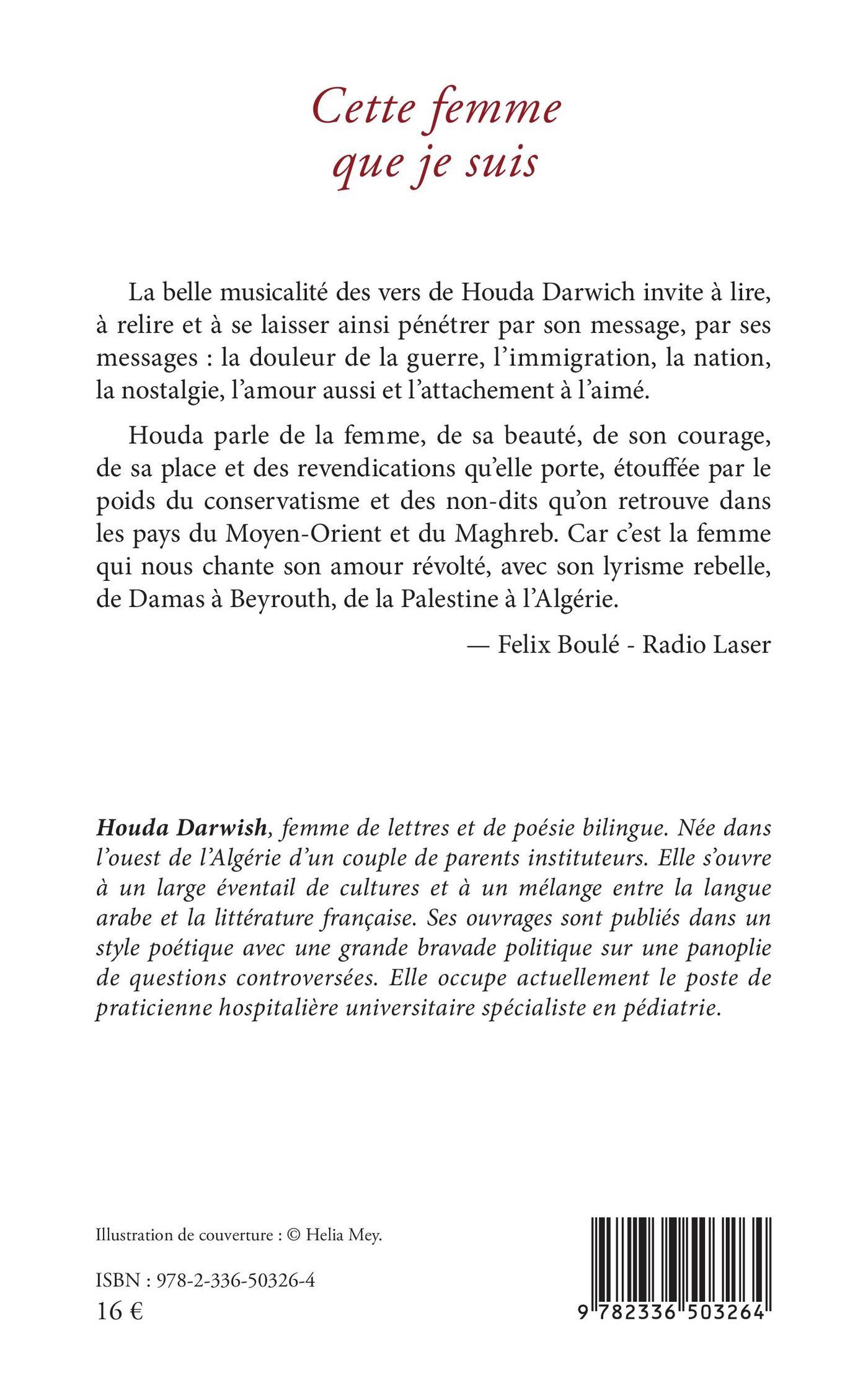 La belle musicalité des vers de Houda Darwich invite à lire, à relire et à se laisser ainsi pénétrer par son message, par ses messages : la douleur de la guerre, l'immigration, la nation, la nostalgie, l'amour aussi et l'attachement à l'aimé.