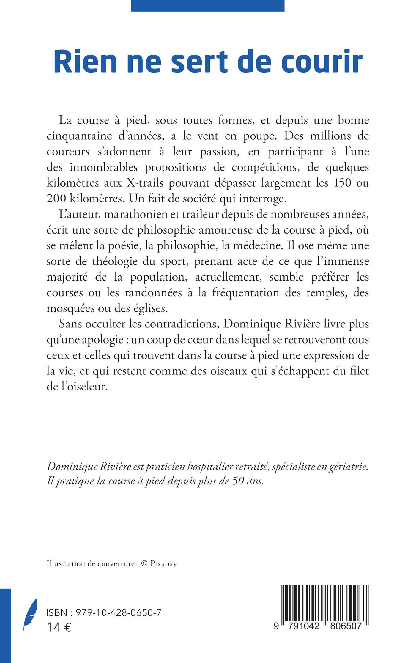 Sans occulter les contradictions, Dominique Rivière livre plus qu’une apologie : un coup de cœur dans lequel se retrouveront tous ceux et celles qui trouvent dans la course à pied une expression de la vie, et qui restent comme des oiseaux qui s’échappent du filet de l’oiseleur.