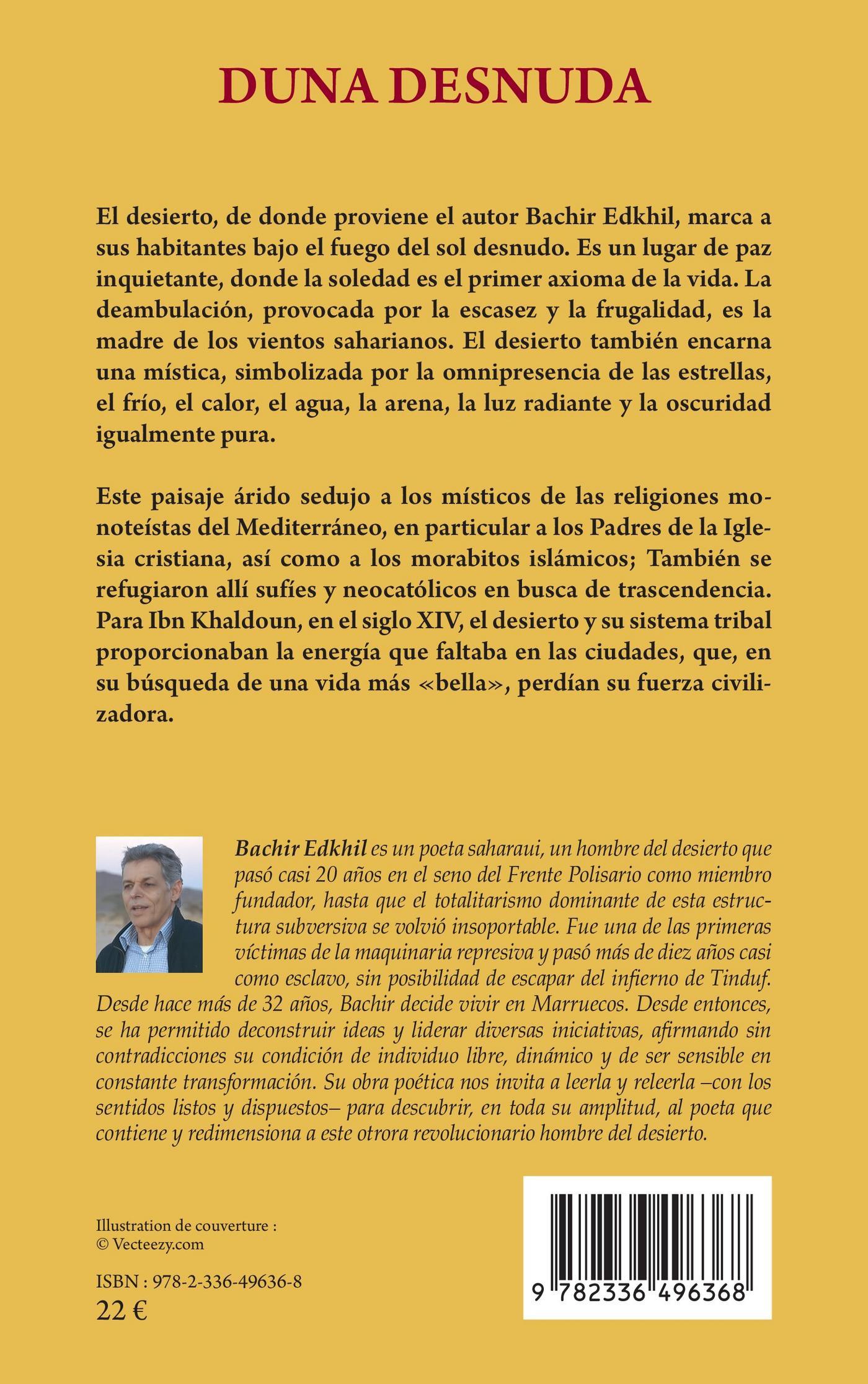 El desierto, de donde proviene el autor Bachir Edkhil, marca a sus habitantes bajo el fuego del sol desnudo. Es un lugar de paz inquietante, donde la soledad es el primer axioma de la vida. La deambulación, provocada por la escasez y la frugalidad, es la madre de los vientos saharianos. El desierto también encarna una mística, simbolizada por la omnipresencia de las estrellas, el frío, el calor, el agua, la arena, la luz radiante y la oscuridad igualmente pura.