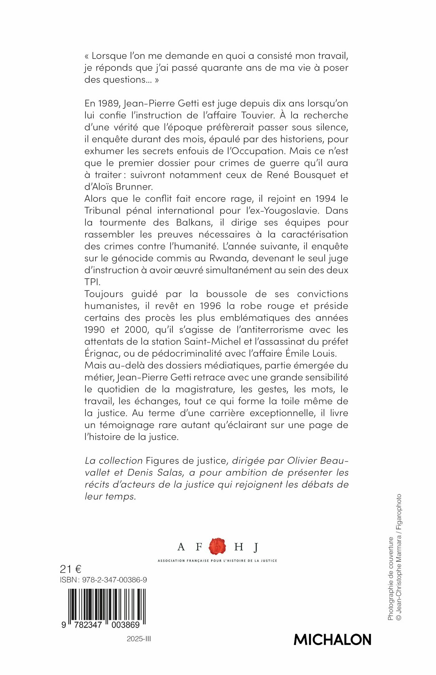 Toujours guidé par la boussole de ses convictions humanistes, il revêt en 1996 la robe rouge et préside certains des procès les plus emblématiques des années 1990 et 2000, qu’il s’agisse de l’antiterrorisme avec les attentats de la station Saint-Michel et l’assassinat du préfet Érignac, ou de pédocriminalité avec l’affaire Émile Louis. Mais au-delà des dossiers médiatiques, partie émergée du métier, Jean-Pierre Getti retrace avec une grande sensibilité le quotidien de la magistrature, les gestes, les mots, le travail, les échanges, tout ce qui forme la toile même de la justice. Au terme d’une carrière exceptionnelle, il livre un témoignage rare autant qu’éclairant sur une page de l’histoire de la justice.