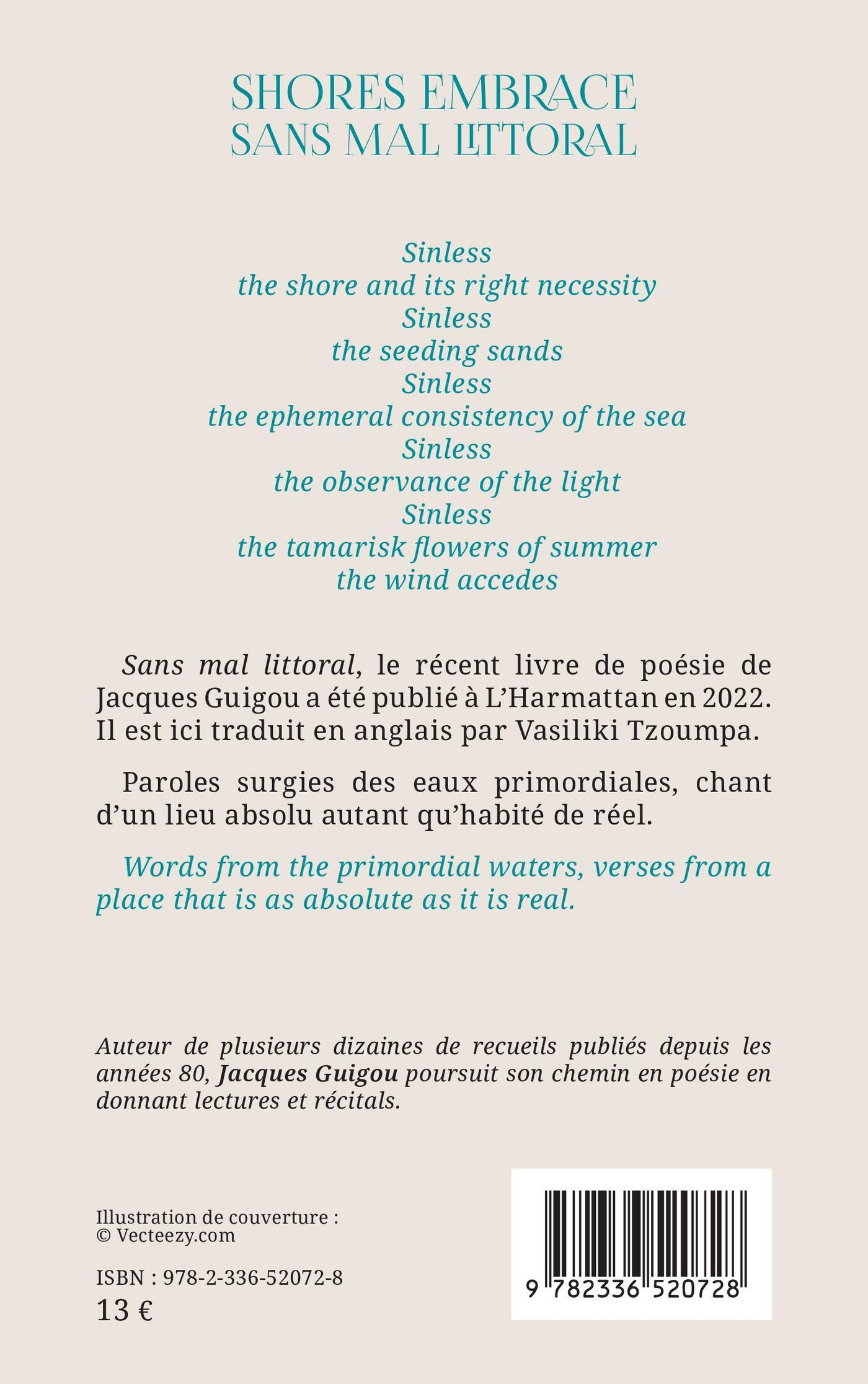Sans mal littoral, le récent livre de poésie de Jacques Guigou a été publié à L’Harmattan en 2022. Il est ici traduit en anglais par Vasiliki Tzoumpa. Paroles surgies des eaux primordiales, chant d’un lieu absolu autant qu’habité de réel. Words from the primordial waters, verses from a place that is as absolute as it is real.
