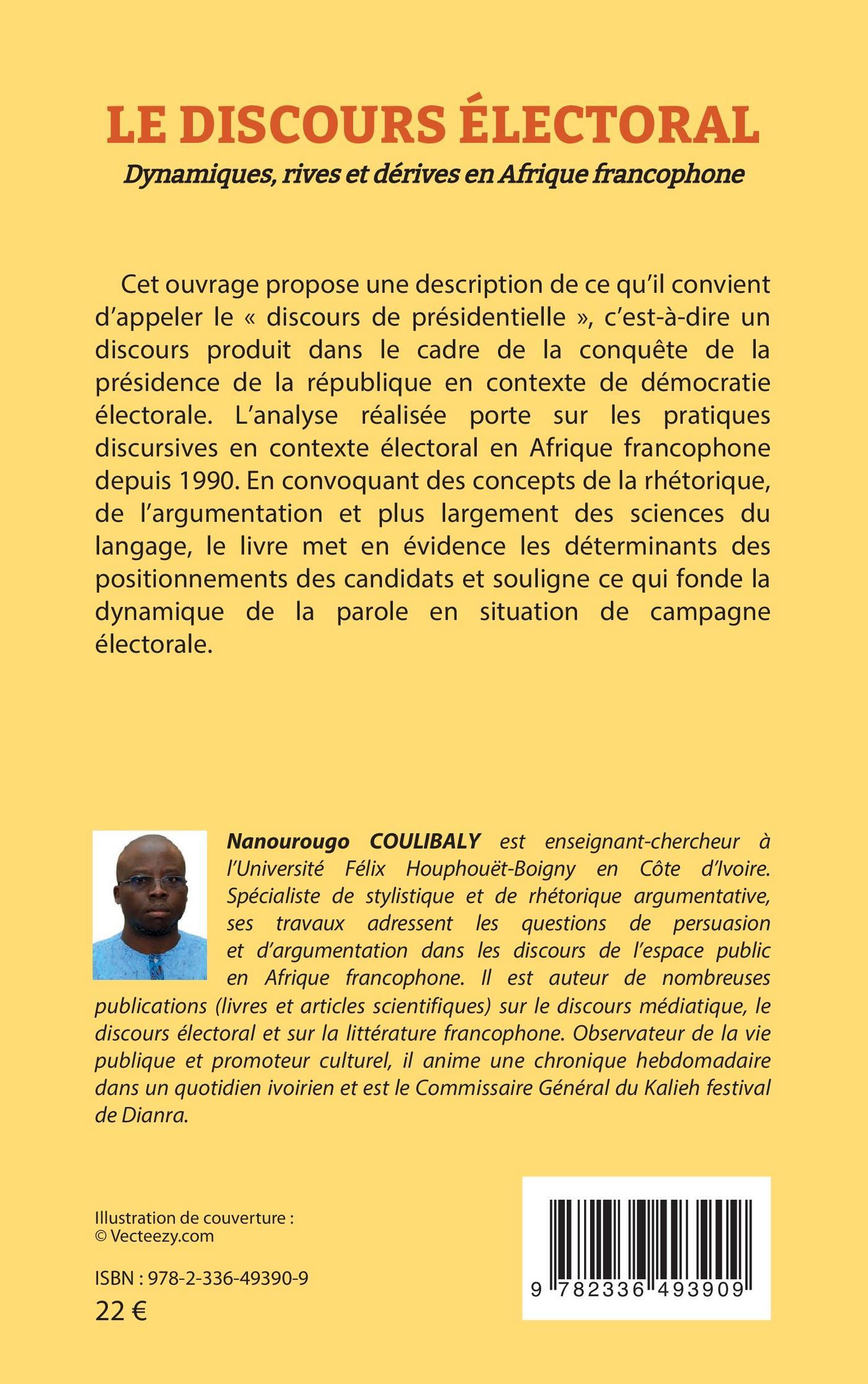 Cet ouvrage propose une description de ce qu’il convient d’appeler le « discours de présidentielle », c’est-à-dire un discours produit dans le cadre de la conquête de la présidence de la république en contexte de démocratie électorale. L’analyse réalisée porte sur les pratiques discursives en contexte électoral en Afrique francophone depuis 1990. En convoquant des concepts de la rhétorique, de l’argumentation et plus largement des sciences du langage, le livre met en évidence les déterminants des positionnements des candidats et souligne ce qui fonde la dynamique de la parole en situation de campagne électorale.