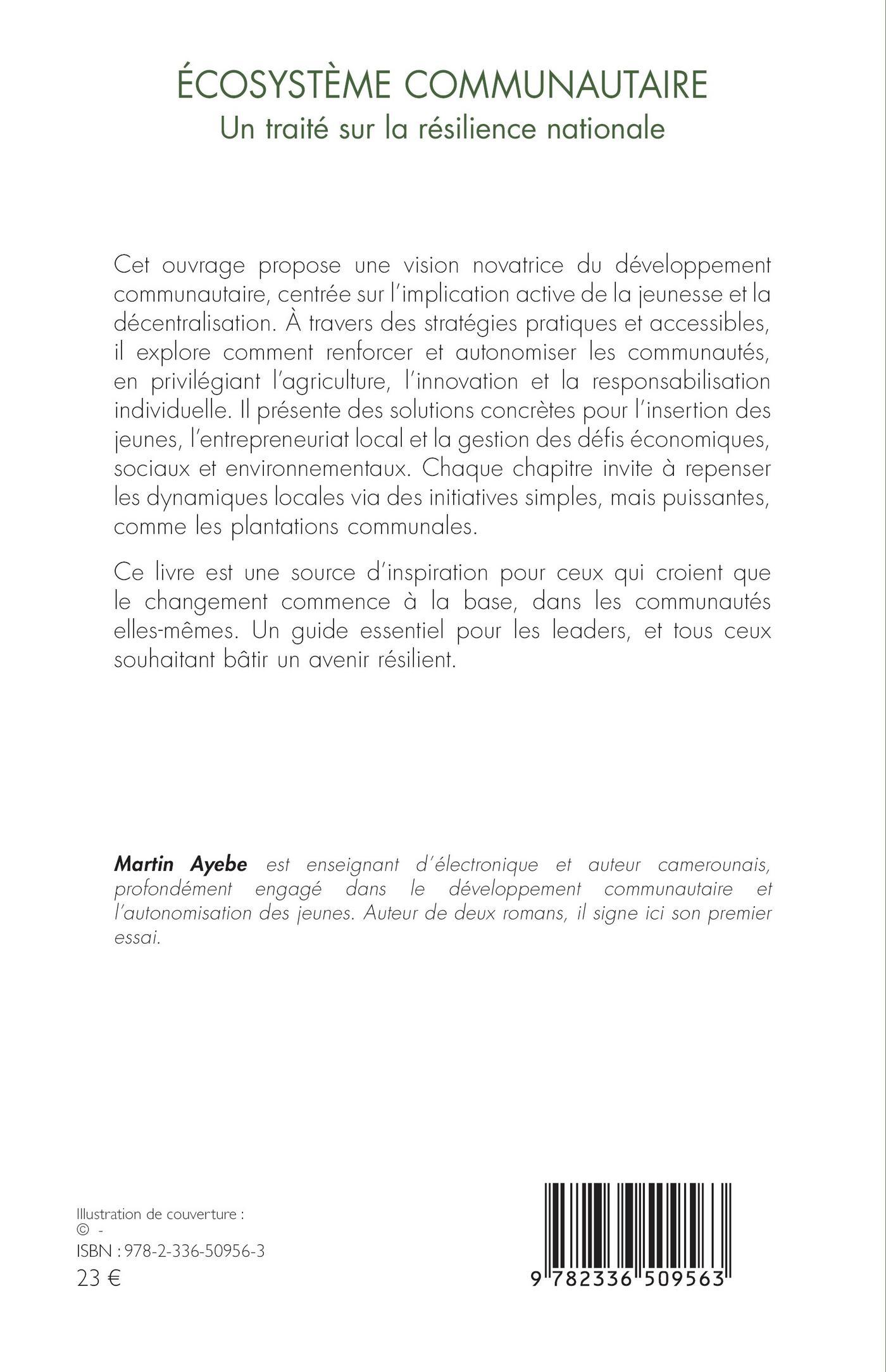 Cet ouvrage propose une vision novatrice du développement communautaire, centrée sur l’implication active de la jeunesse et la décentralisation. À travers des stratégies pratiques et accessibles, il explore comment renforcer et autonomiser les communautés, en privilégiant l’agriculture, l’innovation et la responsabilisation individuelle. Il présente des solutions concrètes pour l’insertion des jeunes, l’entrepreneuriat local et la gestion des dé s économiques, sociaux et environnementaux. Chaque chapitre invite à repenser les dynamiques locales via des initiatives simples, mais puissantes, comme les plantations communales.