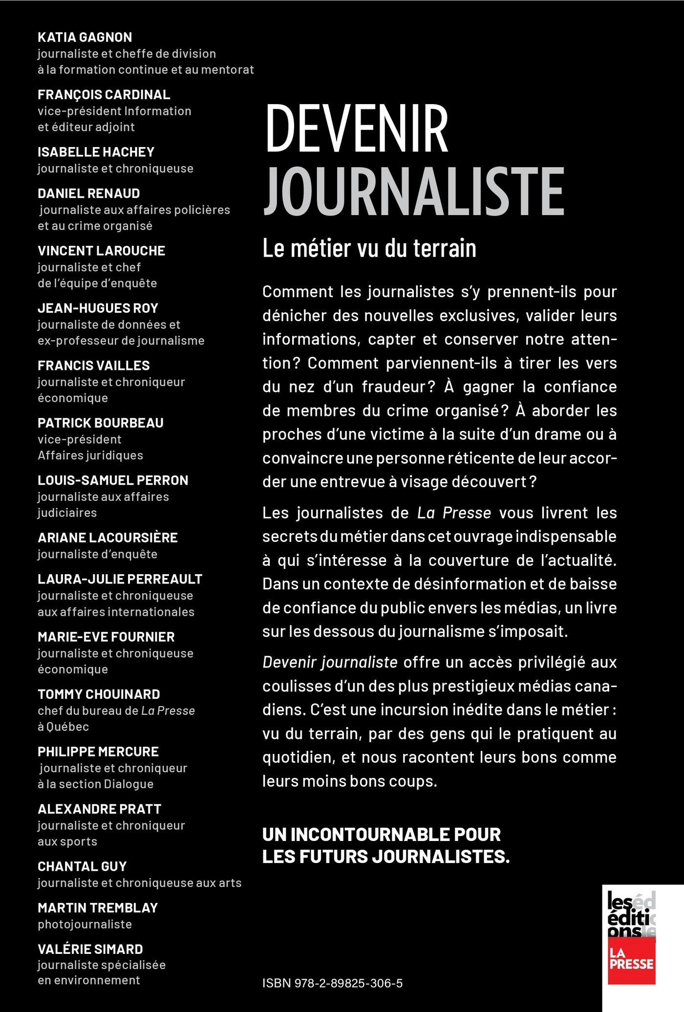 Comment les journalistes s’y prennent-ils pour dénicher des nouvelles exclusives, valider leurs informations, capteret conserver notre attention ?Comment parviennent-ils à tirer les vers du nez d’un fraudeur ? À gagner la confiance de membres du crime organisé ? À aborderles proches d’une victime à la suite d’un drame ou à convaincre une personne réticente de leur accorder une entrevue à visage découvert ?Les journalistes de La Presse vous livrent les secrets du métier dans cet ouvrage indispensable à qui s’intéresse à la couverture de l’actualité.Devenir journaliste offre un accès privilégié aux coulisses d’un desplus prestigieux médias canadiens. C’est une incursion inédite dans le métier : vu du terrain, par des gens qui le pratiquent au quotidien, et nous racontent leurs bons comme leurs moins bons coups.Un incontournable pour les futurs journalistes.