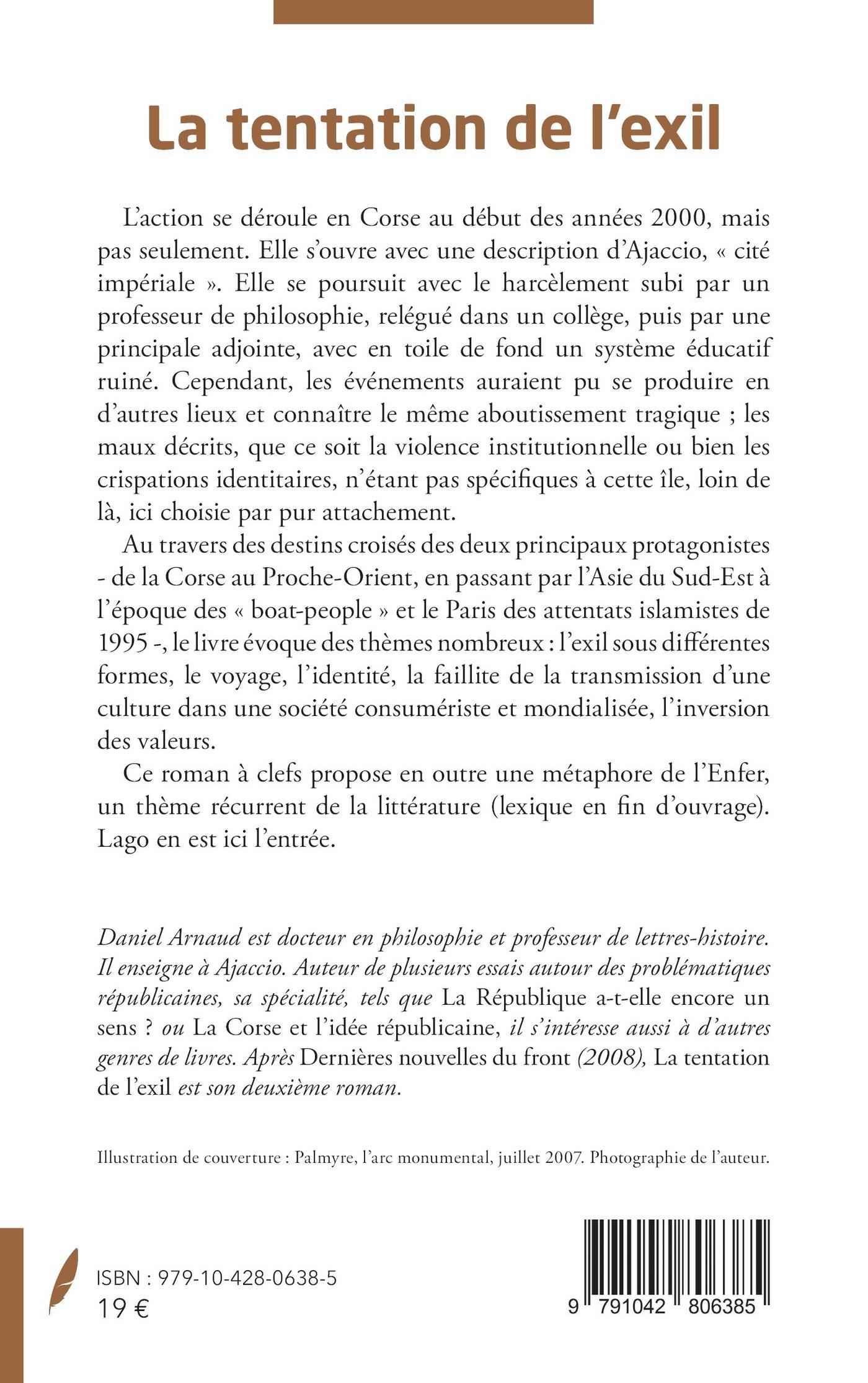 L’action se déroule en Corse au début des années 2000, mais pas seulement. Elle s’ouvre avec une description d’Ajaccio, « cité impériale ». Elle se poursuit avec le harcèlement subi par un professeur de philosophie, relégué dans un collège, puis par une principale adjointe, avec en toile de fond un système éducatif ruiné. Cependant, les événements auraient pu se produire en d’autres lieux et connaître le même aboutissement tragique ; les maux décrits, que ce soit la violence institutionnelle ou bien les crispations identitaires, n’étant pas spécifiques à cette île, loin de là, ici choisie par pur attachement.