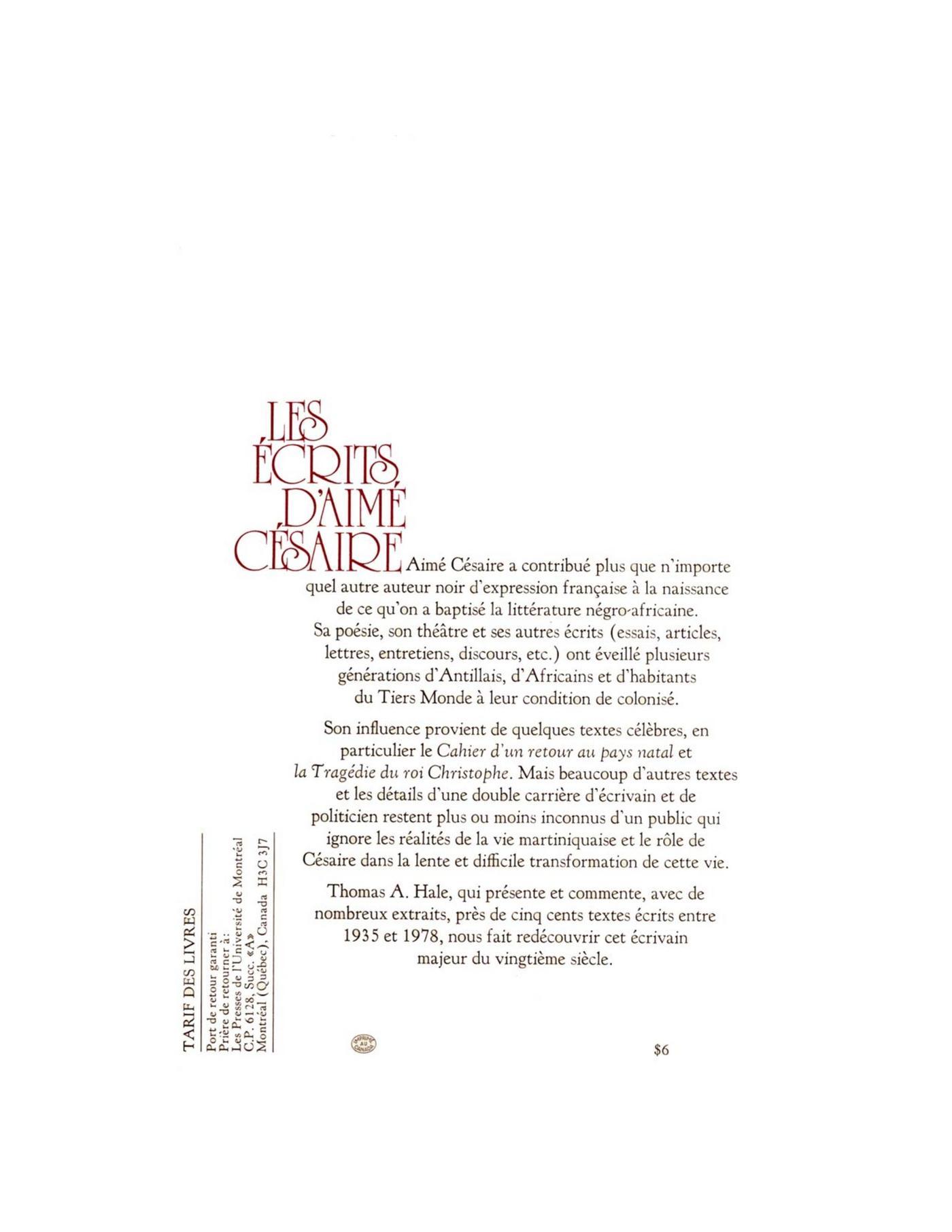 Aimé Césaire a contribué plus que n’importe quel autre auteur noir d’expression française à la naissance de ce qu’on a baptisé la littérature négro-africaine. Sa poésie, son théâtre et ses autres écrits (essais, articles, lettres, entretiens, discours, etc.) ont éveillé plusieurs générations d’Antillais, d’Africains et d’habitants du Tiers Monde à leur condition de colonisé.Son influence provient de quelques textes célèbres, en particulier le Cahier d’un retour au pays natal et La Tragédie du roi Christophe. Mais beaucoup d’autres textes et les détails d’une double carrière d’écrivain et de politicien restent plus ou moins inconnus d’un public qui ignore les réalités de la vie martiniquaise et le rôle de Césaire dans la lente et difficile transformation de cette vie.Thomas A. Hale, qui présente et commente, avec de nombreux extraits, près de cinq cents textes écrits entre 1935 et 1978, nous fait redécouvrir cet écrivain majeur du vingtième siècle.