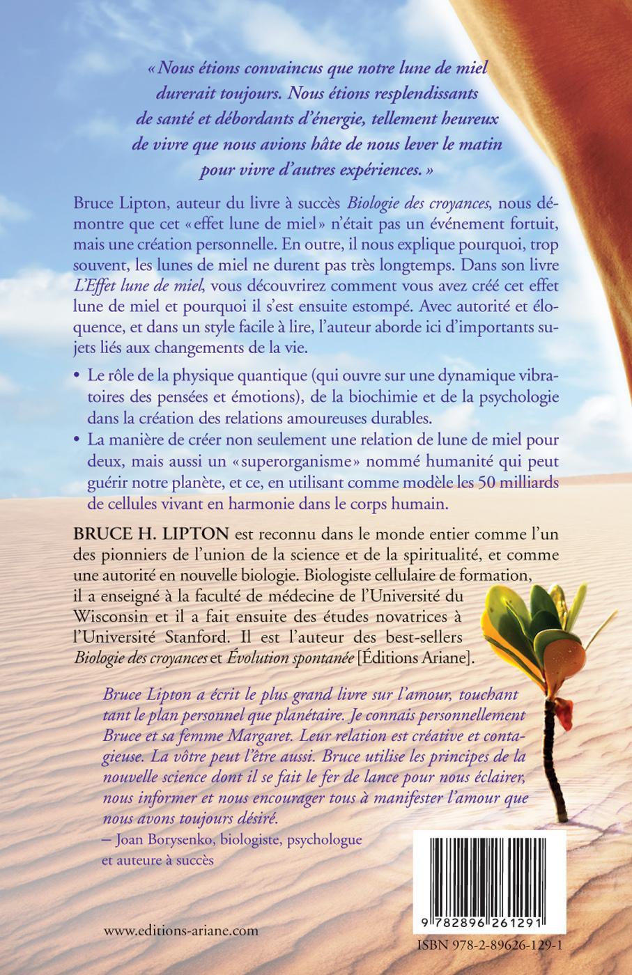 « Nous étions convaincus que notre lune de miel durerait toujours. Nous étions resplendissants de santé et débordants d’énergie, tellement heureux de vivre que nous avions hâte de nous lever le matin pour vivre d’autres expériences. » Bruce Lipton, auteur du livre à succès Biologie des croyances, nous démontre que cet « effet lune de miel » n’était pas un événement fortuit, mais une création personnelle. En outre, il nous explique pourquoi, trop souvent, les lunes de miel ne durent pas très longtemps. Dans son livre L’Effet lune de miel, vous découvrirez comment vous avez créé cet effet lune de miel et pourquoi il s’est ensuite estompé. Avec autorité et éloquence, et dans un style facile à lire, l’auteur aborde ici d’importants sujets liés aux changements de la vie. Le rôle de la physique quantique (les bonnes vibrations), de la biochimie (les philtres d’amour) et de la psychologie (l’esprit conscient et le subconscient) dans la création et le maintien des relations amoureuses. La manière de créer non seulement une relation de lune de miel pour deux, mais aussi un « superorganisme » nommé humanité qui peut guérir notre planète, et ce, en utilisant comme modèle les 50 milliards de cellules vivant en harmonie dans le corps humain. Sa saga personnelle, depuis ses relations dysfonctionnelles jusqu’à sa lune de miel de dix-sept ans avec sa partenaire Margaret. La marche à suivre pour créer des relations amoureuses durables dans notre vie quotidienne. Le savoir dispensé dans cet ouvrage vous permettra de créer une nouvelle lune de miel qui vous garantira une vie heureuse.