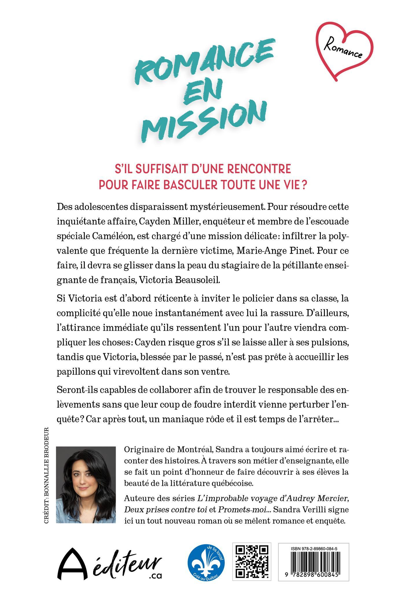 S’IL SUFFISAIT D’UNE RENCONTRE POUR FAIRE BASCULER TOUTE UNE VIE ? Des adolescentes disparaissent mystérieusement. Pour résoudre cette inquiétante affaire, Cayden Miller, enquêteur et membre de l’escouade spéciale Caméléon, est chargé d’une mission délicate : infiltrer la polyvalente que fréquente la dernière victime, Marie-Ange Pinet. Pour ce faire, il devra se glisser dans la peau du stagiaire de la pétillante enseignante de français, Victoria Beausoleil. Si Victoria est d’abord réticente à inviter le policier dans sa classe, la complicité qu’elle noue instantanément avec lui la rassure.