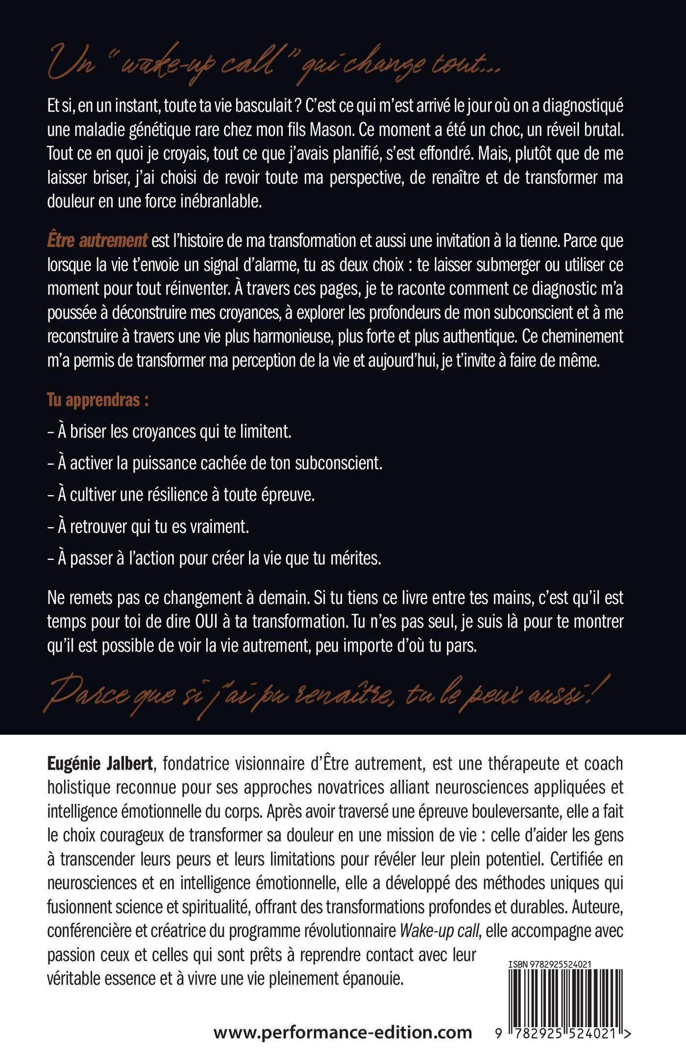 Un "wake-up" call qui change tout...Et si, en un instant, toute ta vie basculait ? C’est ce qui m’est arrivé le jour où ona diagnostiqué une maladie génétique rare chez mon fils Mason. Ce moment a été un choc, un réveil brutal. Tout ce en quoi je croyais, tout ce que j’avais planifié, s’est effondré. Mais, plutôt que de me laisser briser, j’ai choisi de revoir toute ma perspective, de renaître et de transformer ma douleur en une force inébranlable.Être autrement est l’histoire de ma transformation et aussi une invitation à latienne. Parce que lorsque la vie t’envoie un signal d’alarme, tu as deux choix : telaisser submerger ou utiliser ce moment pour tout réinventer. À travers ces pages,je te raconte comment ce diagnostic m’a poussée à déconstruire mes croyances,à explorer les profondeurs de mon subconscient et à me reconstruire à traversune vie plus harmonieuse, plus forte et plus authentique. Ce cheminement m’apermis de transformer ma perception de la vie et aujourd’hui, je t’invite à faire de même.Tu apprendras:– À briser les croyances qui te limitent.– À activer la puissance cachée de ton subconscient.– À cultiver une résilience à toute épreuve.– À retrouver qui tu es vraiment.- À passer à l'action pour créer la vie que tu mérites.Ne remets pas ce changement à demain. Si tu tiens ce livre entre tes mains, c’est qu’il est temps pour toi de dire oui à ta transformation.Tu n’es pas seule, je suis là pour te montrer qu’il est possible de voir la vie autrement, peu importe d’où tu pars.Parce que si j'ai pu renaître, tu le peux aussi!