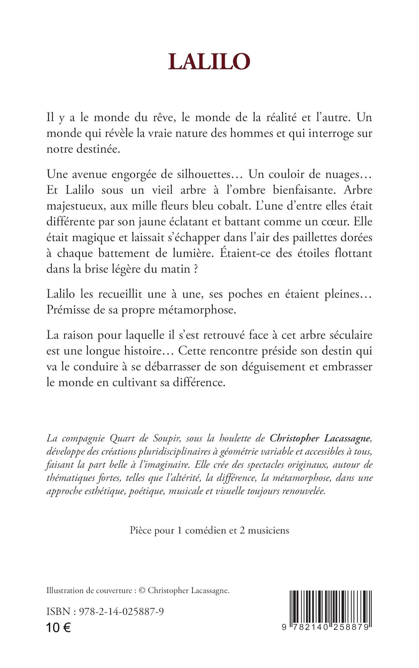 Il y a le monde du rêve, le monde de la réalité et l’autre. Un monde qui révèle la vraie nature des hommes et qui interroge sur notre destinée. Une avenue engorgée de silhouettes... Un couloir de nuages... Et Lalilo sous un vieil arbre à l’ombre bienfaisante. Arbre majestueux, aux mille fleurs bleu cobalt. L’une d’entre elles était différente par son jaune éclatant et battant comme un coeur. Elle était magique et laissait s’échapper dans l’air des paillettes dorées à chaque battement de lumière. Étaient-ce des étoiles flottant dans la brise légère du matin ? Lalilo les recueillit une à une, ses poches en étaient pleines... Prémisse de sa propre métamorphose. La raison pour laquelle il s’est retrouvé face à cet arbre séculaire est une longue histoire... Cette rencontre préside son destin qui va le conduire à se débarrasser de son déguisement et embrasser le monde en cultivant sa différence.