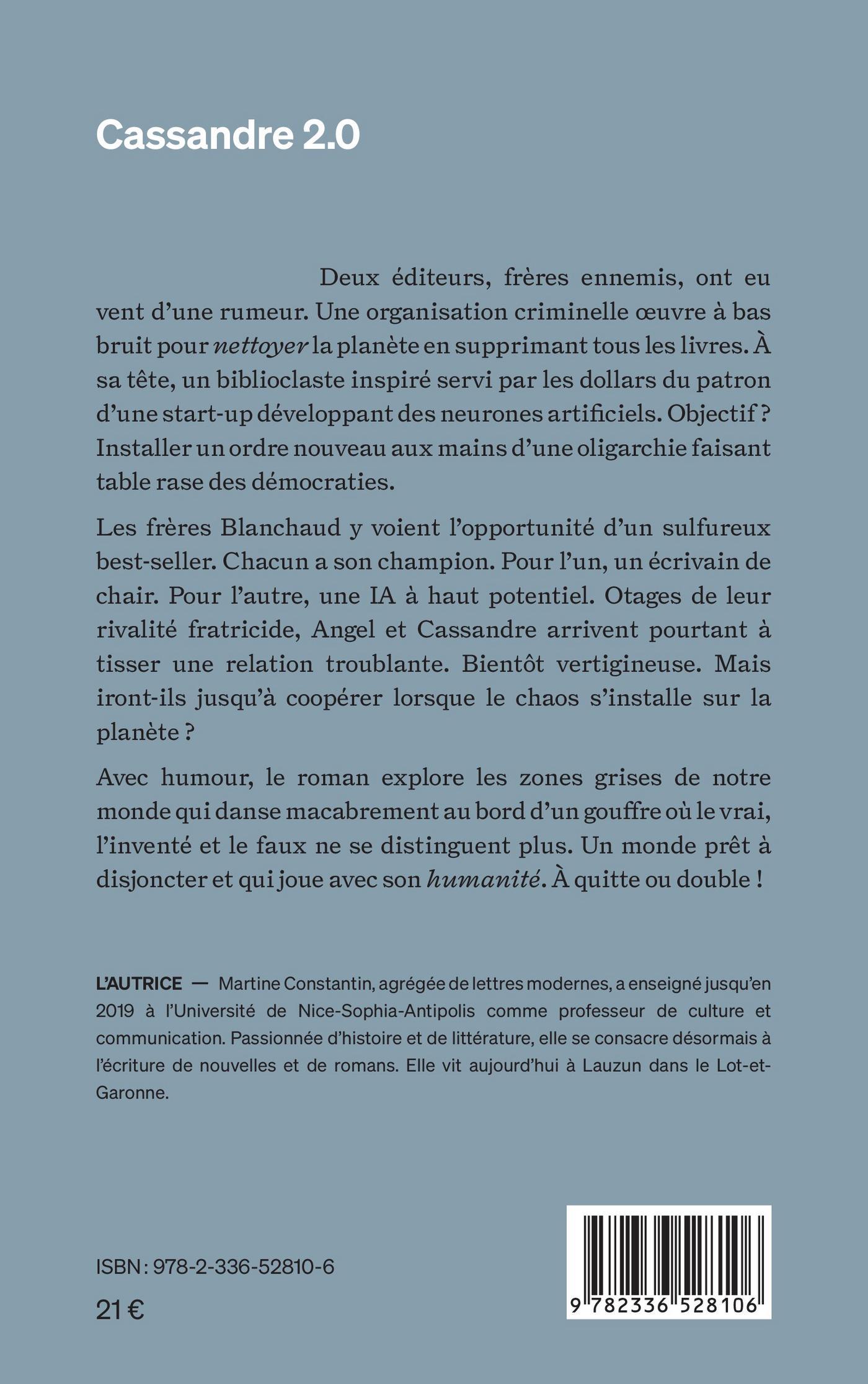 Les frères Blanchaud y voient l’opportunité d’un sulfureux best-seller. Chacun a son champion. Pour l’un, un écrivain de chair. Pour l’autre, une IA à haut potentiel. Otages de leur rivalité fratricide, Angel et Cassandre arrivent pourtant à tisser une relation troublante. Bientôt vertigineuse. Mais
