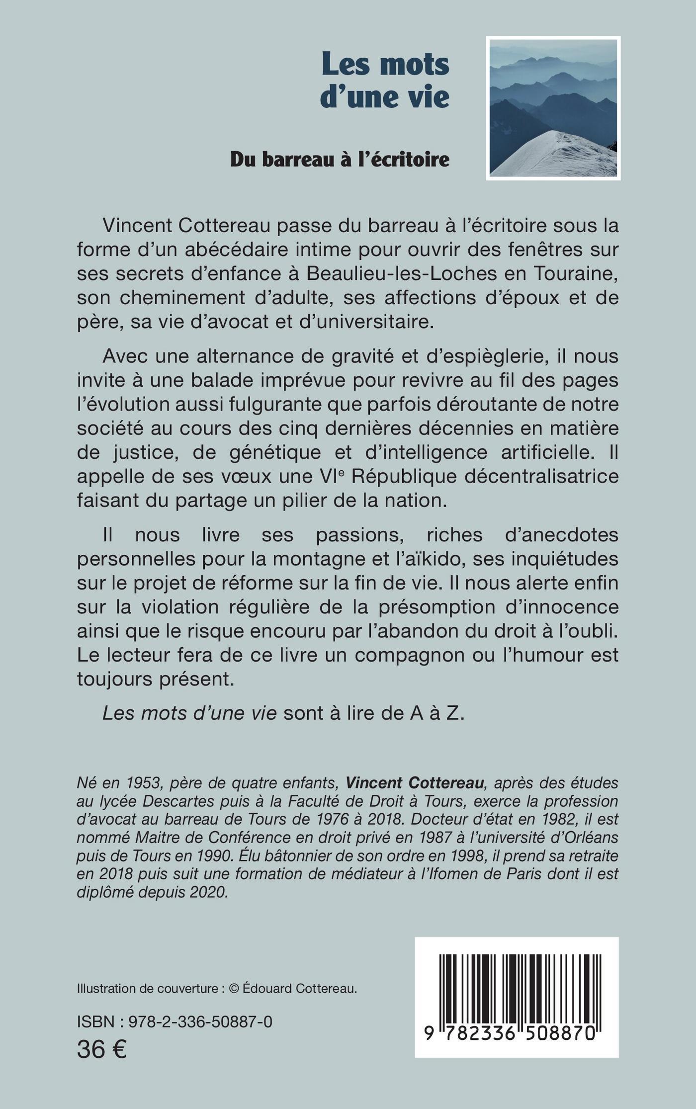 Vincent Cottereau passe du barreau à l’écritoire sous la forme d’un abécédaire intime pour ouvrir des fenêtres sur ses secrets d’enfance à Beaulieu-les-Loches en Touraine, son cheminement d’adulte, ses affections d’époux et de père, sa vie d’avocat et d’universitaire.