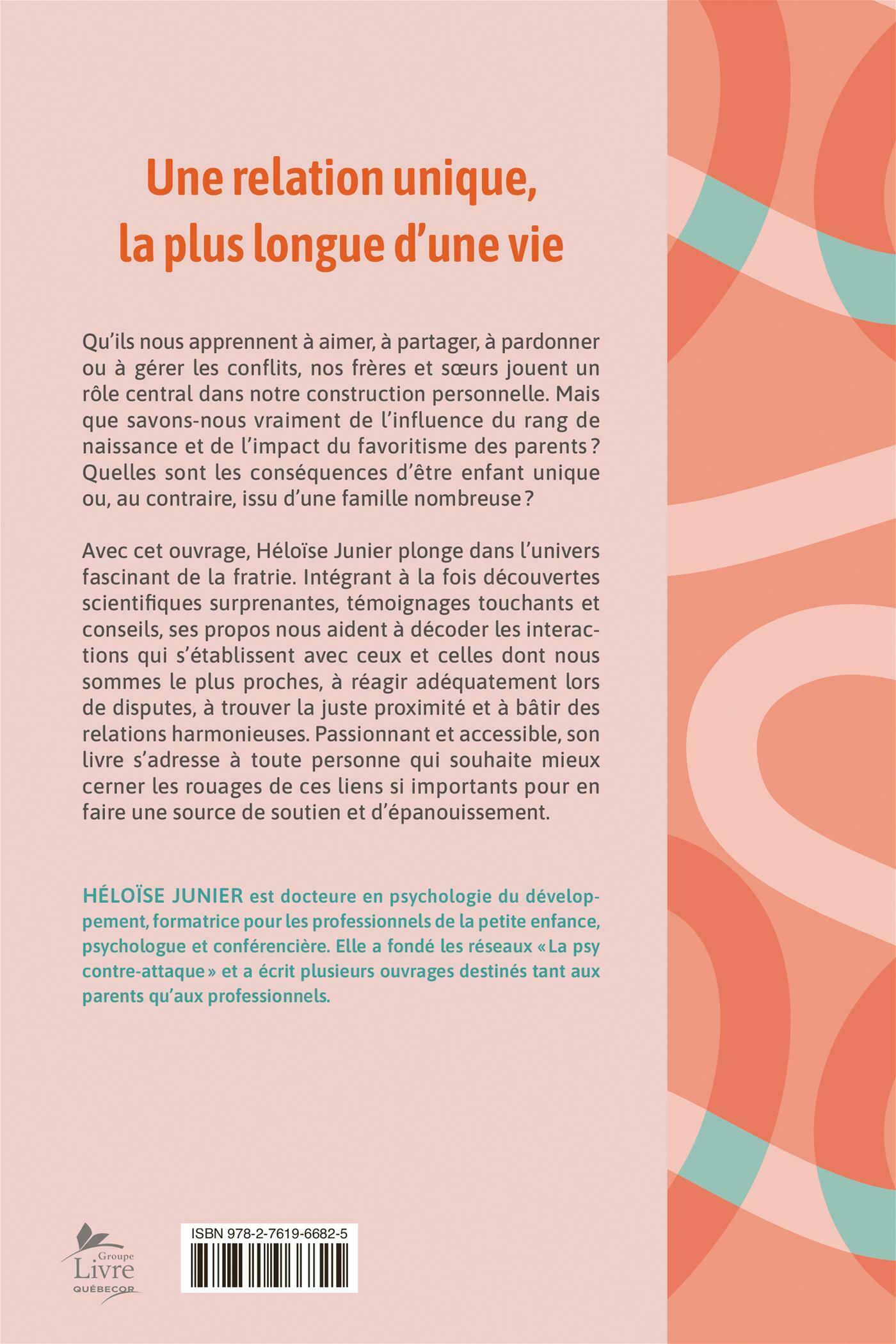 Avec cet ouvrage, Héloïse Junier plonge dans l'univers fascinant de la fratrie. Intégrant à la fois découvertes scientifiques surprenantes, témoignages touchants et conseils, ses propos nous aident à décoder les interactions qui s'établissent avec ceux et celles dont nous sommes le plus proches, à réagir adéquatement lors de disputes, à trouver la juste proximité et à bâtir des relations harmonieuses.