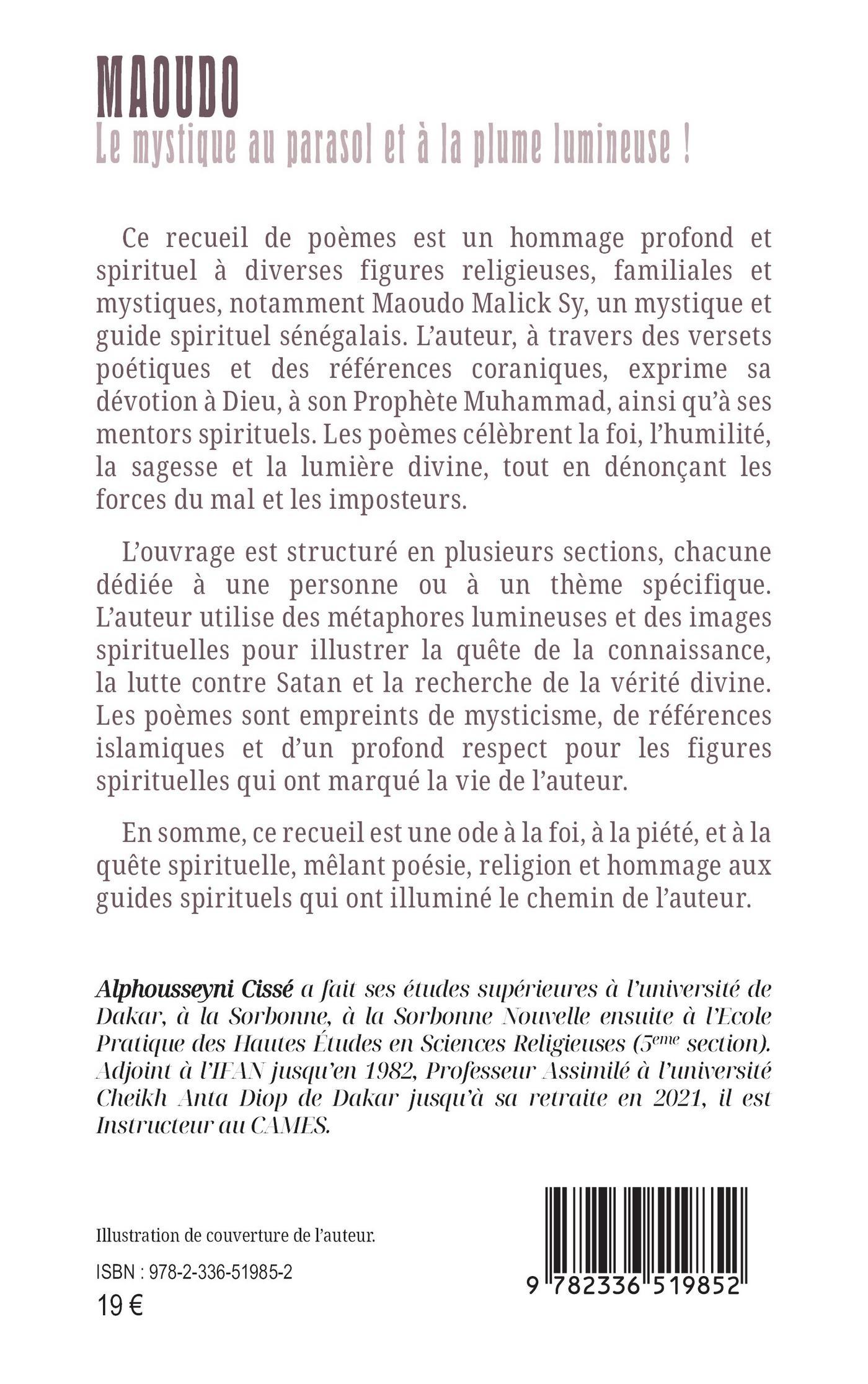 Ce recueil de poèmes est un hommage profond et spirituel à diverses figures religieuses, familiales et mystiques, notamment Maoudo Malick Sy, un mystique et guide spirituel sénégalais. L’auteur, à travers des versets poétiques et des références coraniques, exprime sa dévotion à Dieu, à son Prophète Muhammad, ainsi qu’à ses mentors spirituels. Les poèmes célèbrent la foi, l’humilité, la sagesse et la lumière divine, tout en dénonçant les forces du mal et les imposteurs.