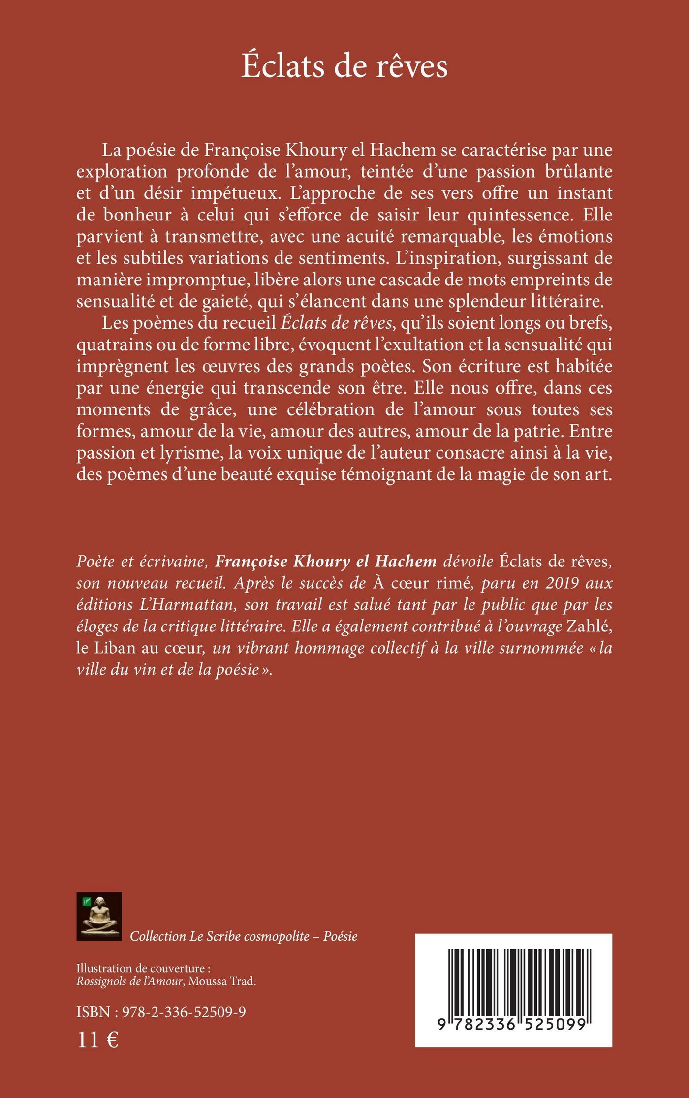 Les poèmes du recueil Éclats de rêves, qu’ils soient longs ou brefs, quatrains ou de forme libre, évoquent parfois l’exultation et la sensualité érotique qui imprègnent l’œuvre d’Omar Khayyâm. Poète habité par une énergie qui transcende son être, elle nous offre, dans ces moments de grâce, une célébration de l’amour sous toutes ses formes : amour de la vie, amour des autres, amour de la patrie. Entre passion et lyrisme, la voix unique de l’auteur en poésie consacre ainsi à la vie, des poèmes d’une beauté exquise témoignant de la magie de son art.