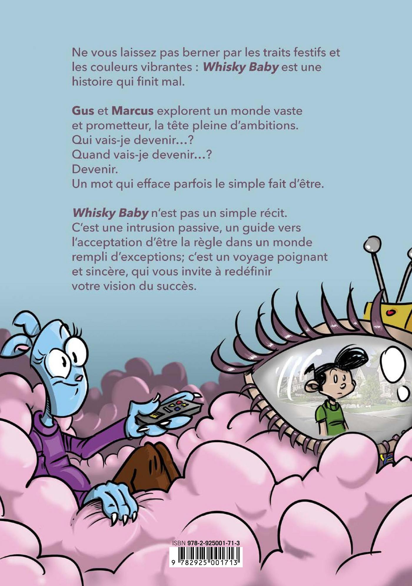 Gus et Marcus explorent un monde vaste et prometteur, la tête pleine d’ambitions. Qui vais-je devenir ? Quand vais-je devenir ?Devenir. Un mot qui efface parfois le simple fait d’être.Whisky Baby n’est pas un simple récit. C’est une intrusion passive, un guide vers l’acceptation d’être la règle dans un monde rempli d’exceptions; c’est un voyage poignant et sincère, qui vous invite à redéfinir votre vision du succès. Et ne vous laissez pas berner par les traits festifs et les couleurs vibrantes : Whisky Baby est une histoire qui finit mal.