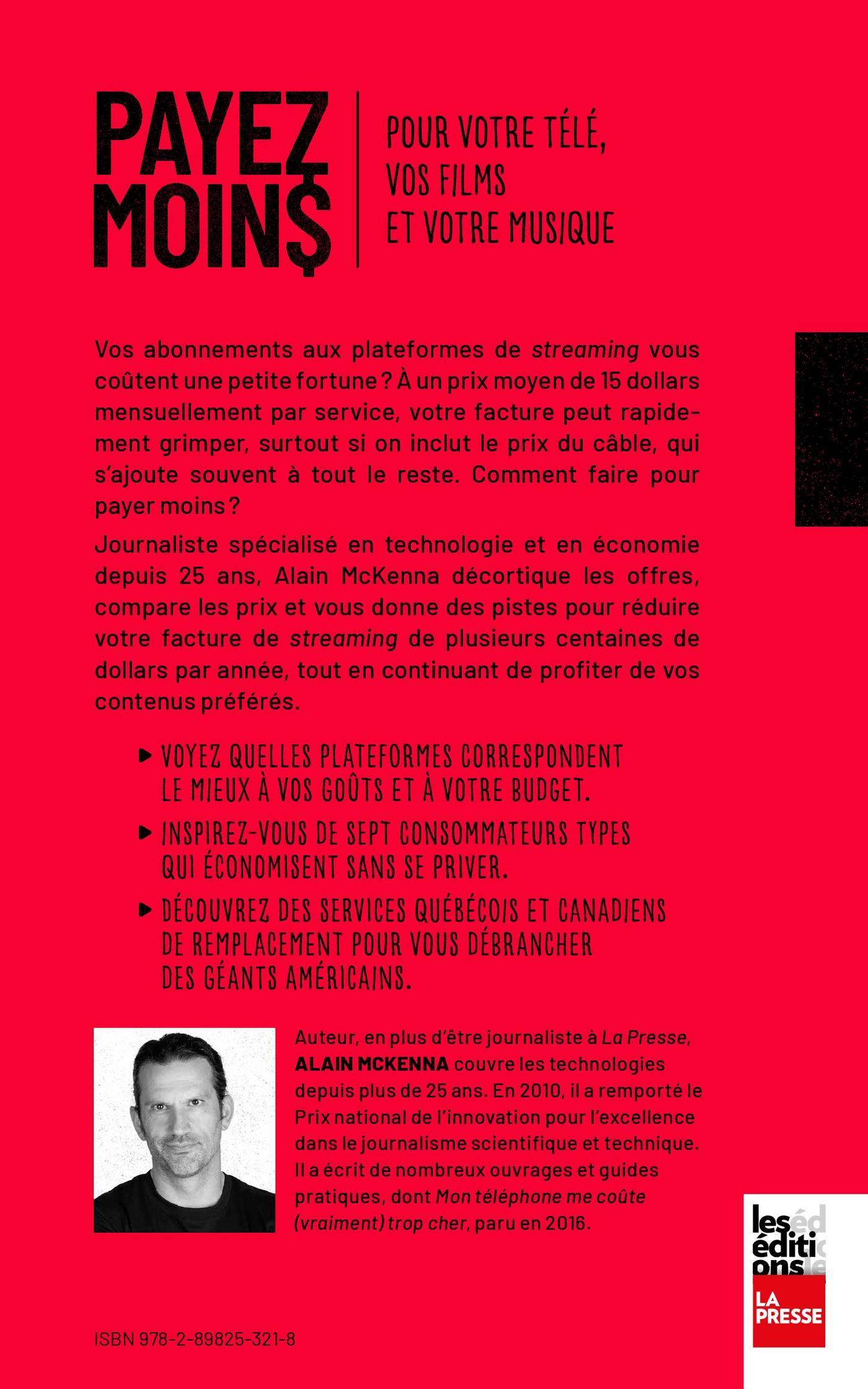Vos abonnements aux plateformes de streaming vous coûtent une petite fortune ? À un prix moyen de 15 dollars mensuellement par service, votre facture peut rapidement grimper, surtout si on inclut le prix du câble, qui s’ajoute souvent à tout le reste. Comment faire pour payer moins ? Journaliste spécialisé en technologie et en économie depuis 25 ans, Alain McKenna décortique les offres, compare les prix et vous donne des pistes pour réduire votre facture de streaming de plusieurs centaines de dollars par année, tout en continuant de profiter de vos contenus préférés.•Voyez quelles plateformes correspondent le mieux à vos goûts et à votre budget.•Inspirez-vous de sept consommateurs types qui économisent sans se priver.•Découvrez des services québécois et canadiens de remplacement pour vous débrancher des géants américains.