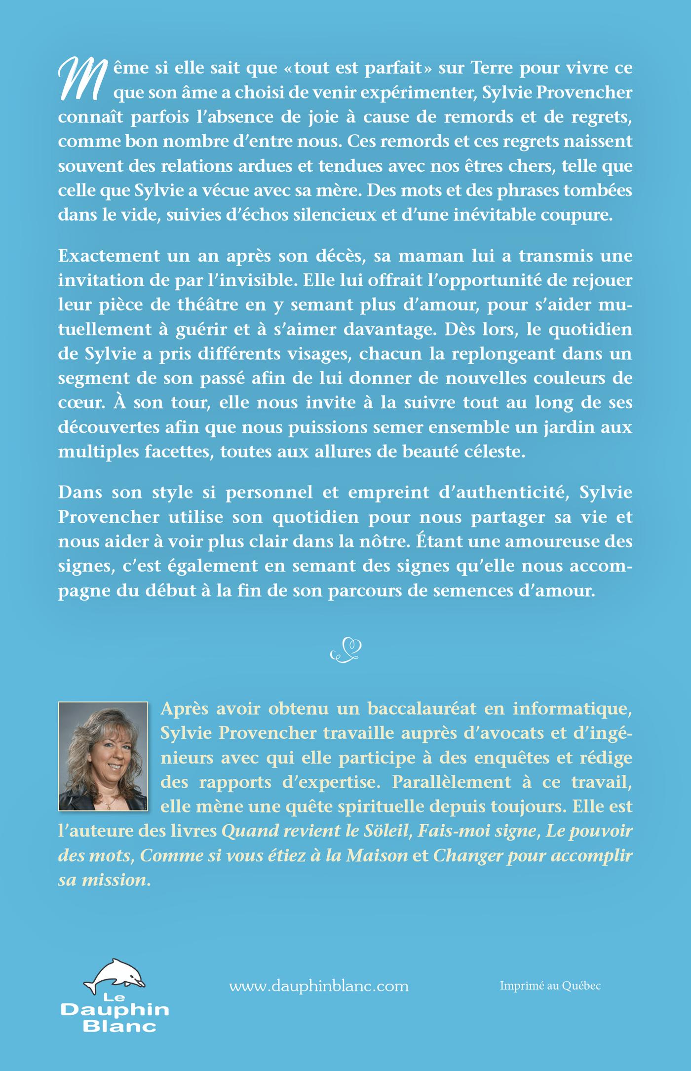 Même si elle sait que «tout est parfait» sur Terre pour vivre ce que son âme a choisi de venir expérimenter, Sylvie Provencher connaît parfois l’absence de joie à cause de remords et de regrets, comme bon nombre d’entre nous. Ces remords et ces regrets naissent souvent des relations ardues et tendues avec nos êtres chers, telle que celle que Sylvie a vécue avec sa mère. Des mots et des phrases tombées dans le vide, suivies d’échos silencieux et d’une inévitable coupure.Exactement un an après son décès, sa maman lui a transmis une invitation de par l’invisible. Elle lui offrait l’opportunité de rejouer leur pièce de théâtre en y semant plus d’amour, pour s’aider mutuellement à guérir et à s’aimer davantage. Dès lors, le quotidien de Sylvie a pris différents visages, chacun la replongeant dans un segment de son passé afin de lui donner de nouvelles couleurs de cœur. À son tour, elle nous invite à la suivre tout au long de ses découvertes afin que nous puissions semer ensemble un jardin aux multiples facettes, toutes aux allures de beauté céleste.Dans son style si personnel et empreint d’authenticité, Sylvie Provencher utilise son quotidien pour nous partager sa vie et nous aider à voir plus clair dans la nôtre. Étant une amoureuse des signes, c’est également en semant des signes qu’elle nous accompagne du début à la fin de son parcours de semences d’amour. L'auteure :Après avoir obtenu un baccalauréat en informatique, Sylvie Provencher travaille auprès d’avocats et d’ingénieurs avec qui elle participe à des enquêtes et rédige des rapports d’expertise. Parallèlement à ce travail, elle mène une quête spirituelle depuis toujours. Elle est l’auteure des livres Quand revient le Söleil, Fais-moi signe, Le pouvoir des mots, Comme si vous étiez à la Maison et Changer pour accomplir sa mission.