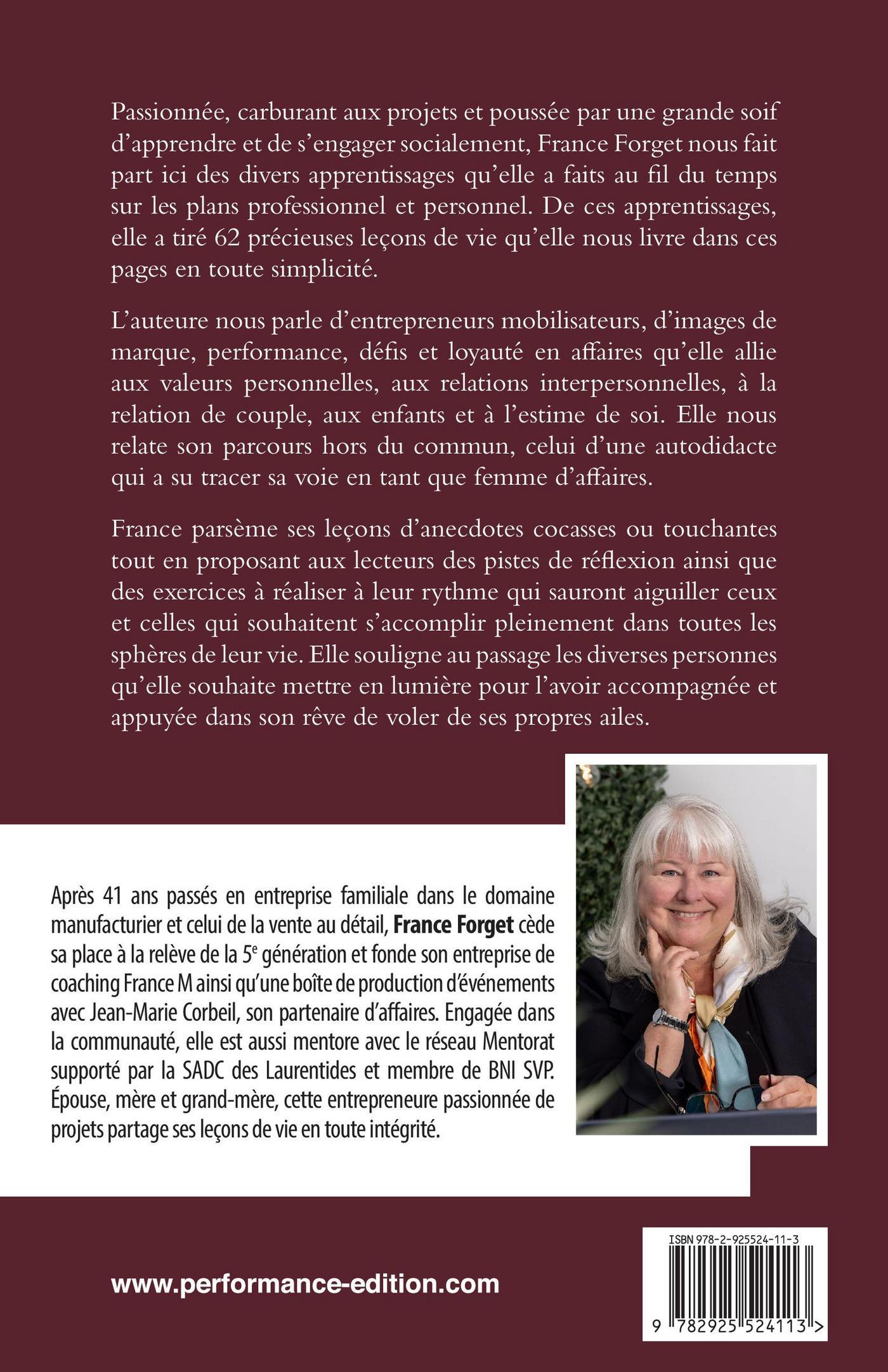Passionnée, carburant aux projets et poussée par une grande soif d’apprendre et de s’engager socialement, France Forget nous fait part ici des divers apprentissages qu’elle a faits au fil du temps sur les plans professionnel etpersonnel. De ces apprentissages, elle a tiré 62 précieuses leçons de vie qu’elle nous livre dans ces pages en toute simplicité.L’auteure nous parle d’entrepreneurs mobilisateurs, d’images de marque, performance, défis et loyauté en affaires se mêlent aux valeurs personnelles, aux relations interpersonnelles, à la relation de couple, aux enfants et à l’estime de soi. Elle nous relate son parcours hors du commun, celui d’une autodidacte qui a su tracer sa voie en tant que femme d’affaires.France parsème ses leçons d’anecdotes cocasses ou touchantes tout en proposant aux lecteurs des pistes de réflexion ainsi que des exercices à réaliser à leur rythme qui sauront aiguiller ceux et celles qui souhaitent s’accomplir pleinement dans toutes les sphères de leur vie. Elle souligne au passage les diverses personnes qu’elle souhaite mettre en lumière pour l’avoiraccompagnée et appuyée dans son rêve de voler de ses propres ailes.