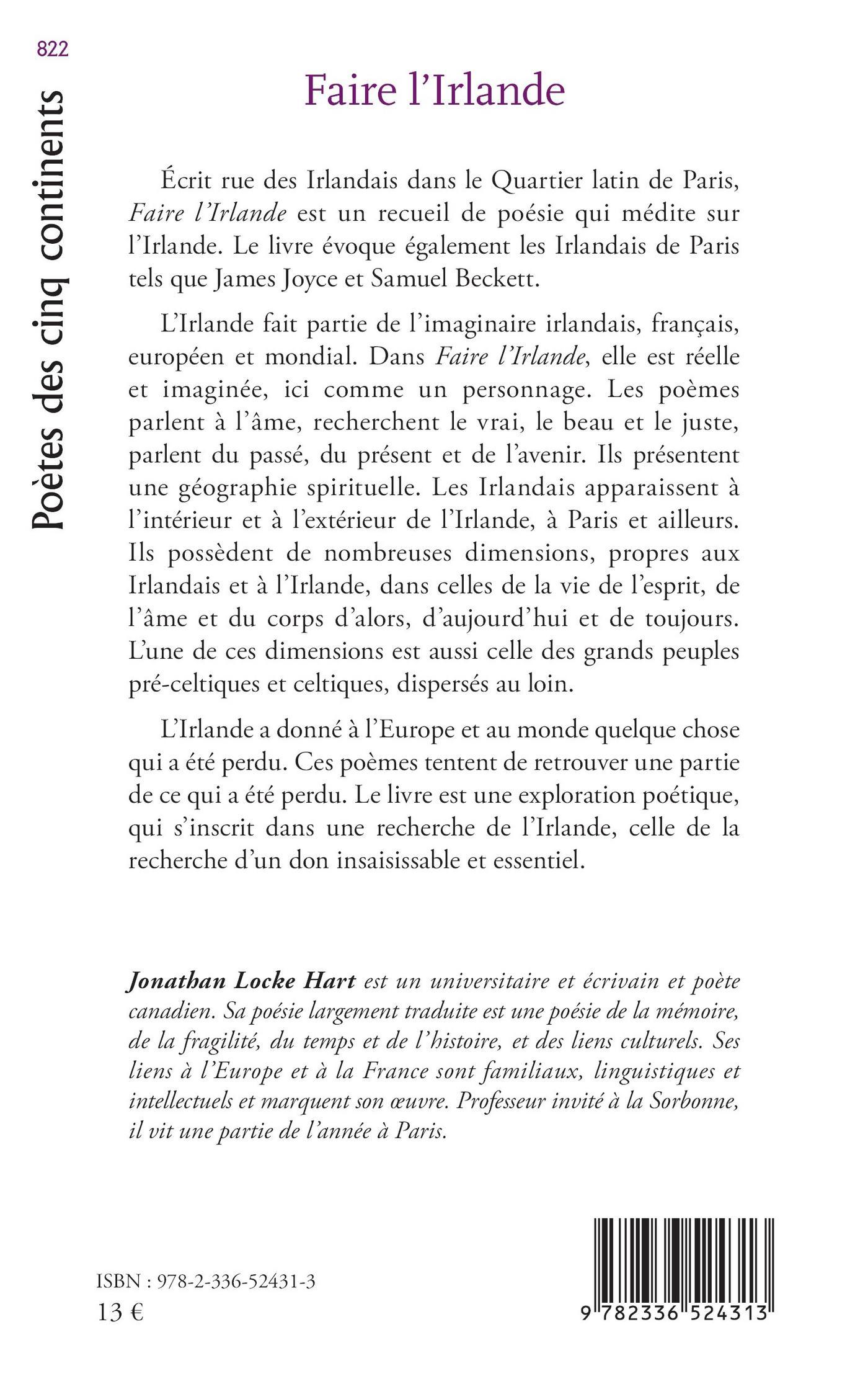 L’Irlande fait partie de l’imaginaire irlandais, français, européen et mondial. L’Irlande dans Faire l’Irlande est réelle et imaginée ici, un personnage. Les poèmes parlent à l’âme, recherchent le vrai, le beau et le juste, parlent du passé, du présent et de l’avenir C’est une collection de géographie spirituelle. Ici, les Irlandais apparaissent à l’intérieur et à l’extérieur de l’Irlande, à Paris et ailleurs. Il y a de nombreuses dimensions aux Irlandais et à l’Irlande dans la vie de l’esprit, de l’esprit et du corps d’alors, d’aujourd’hui et d’aujourd’hui. L’une de ces dimensions, les grands peuples pré-celtiques et celtiques, dispersés au loin.