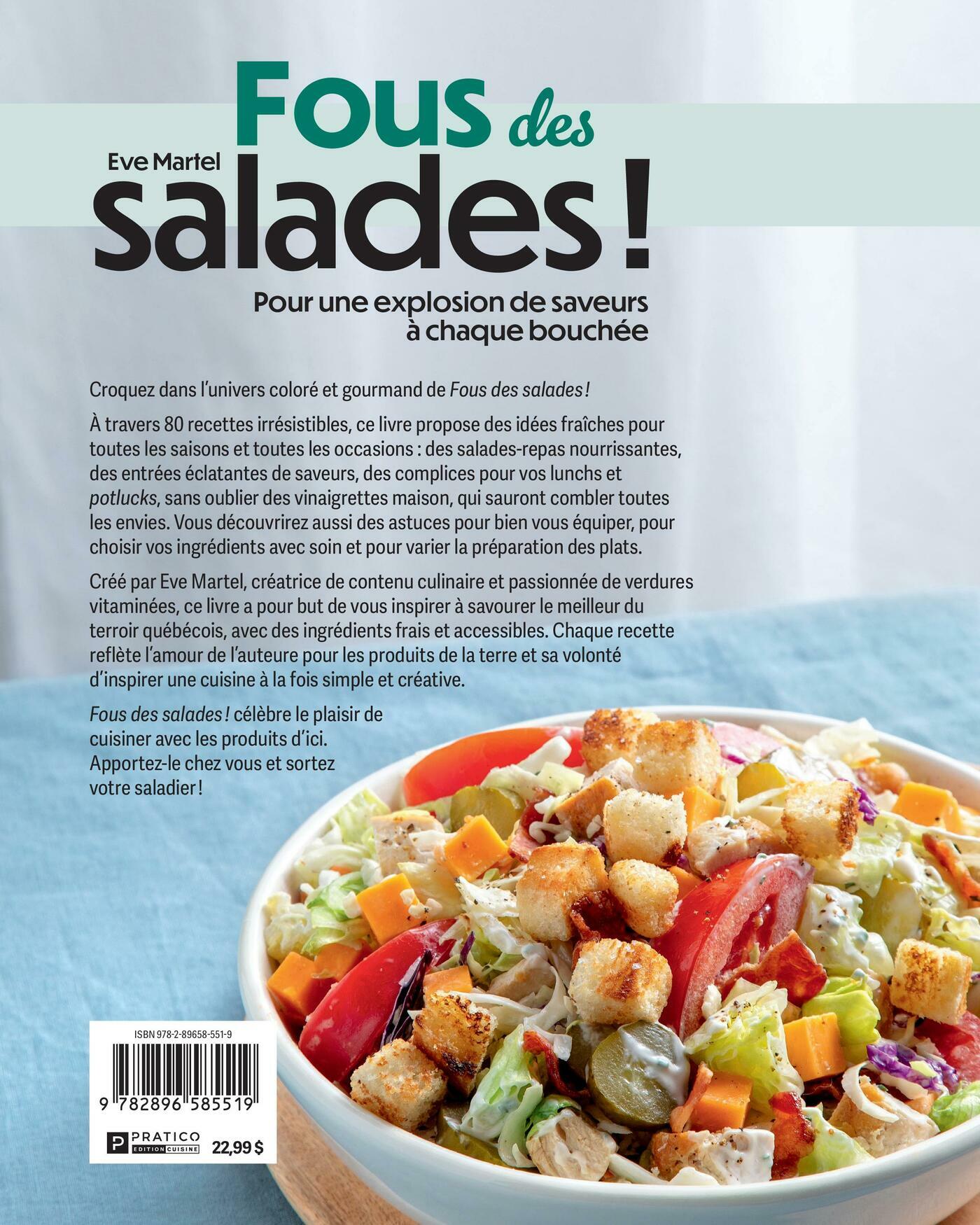 Croquez dans l’univers coloré et gourmand de Fous des salades ! À travers 80 recettes irrésistibles, ce livre propose des idées fraîches pour toutes les saisons et toutes les occasions : des salades-repas nourrissantes, des entrées éclatantes de saveurs, des complices pour vos lunchs et potlucks, sans oublier des vinaigrettes maison, qui sauront combler toutes les envies. Vous découvrirez aussi des astuces pour bien vous équiper, pour choisir vos ingrédients avec soin et pour varier la préparation des plats.Créé par Eve Martel, créatrice de contenu culinaire et passionnée de verdures vitaminées, ce livre a pour but de vous inspirer à savourer le meilleur du terroir québécois, avec des ingrédients frais et accessibles. Chaque recette reflète l’amour de l’auteure pour les produits de la terre et sa volonté d’inspirer une cuisine à la fois simple et créative.Fous des salades ! célèbre le plaisir de cuisiner avec les produits d’ici. Apportez le chez vous et sortez votre saladier !