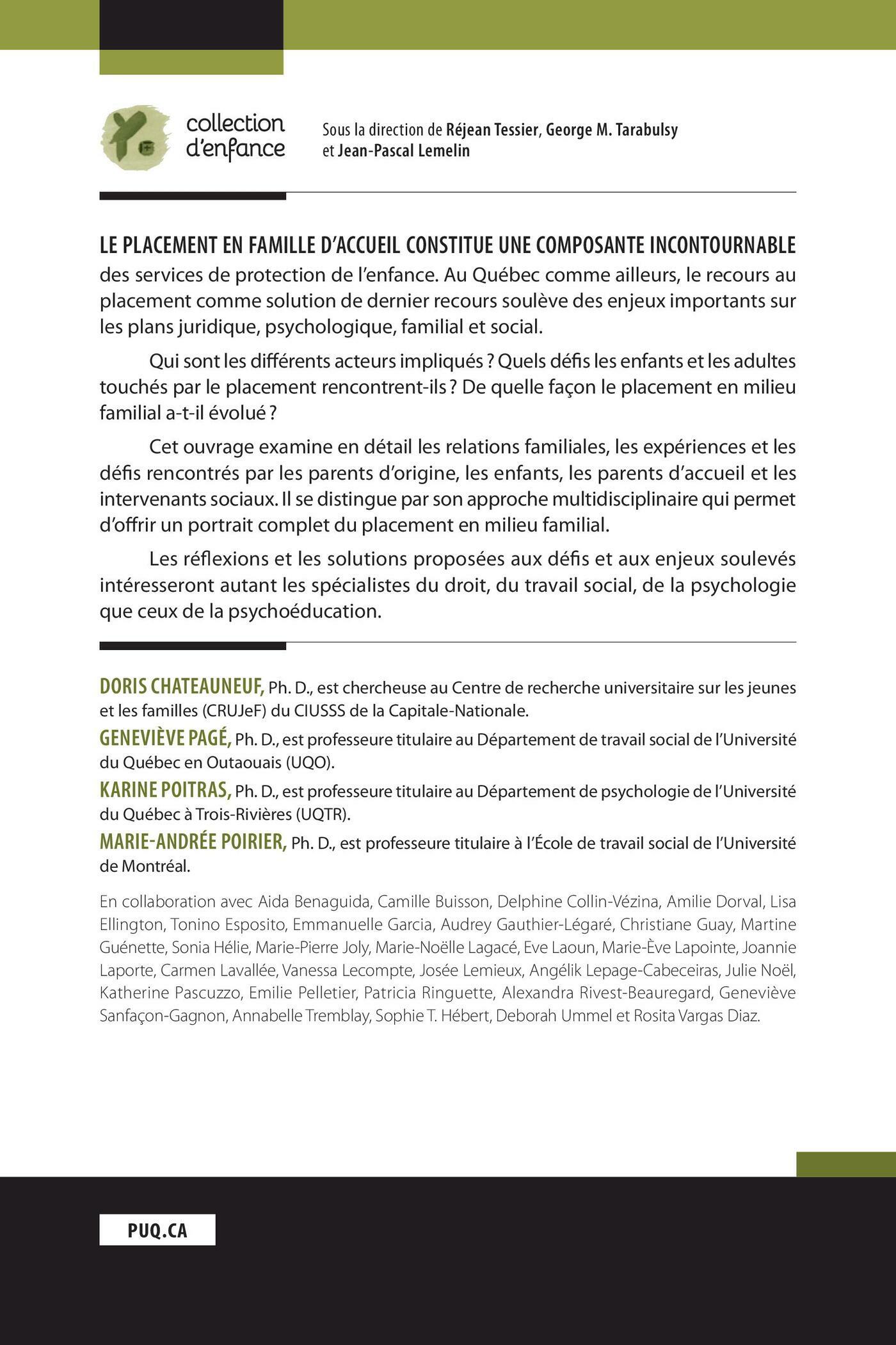 Cet ouvrage examine en détail les relations familiales, les expériences et les défis rencontrés par les parents d’origine, les enfants, les parents d’accueil et les intervenants sociaux. Il se distingue par son approche multidisciplinaire qui permet d’offrir un portrait complet du placement en milieu familial.