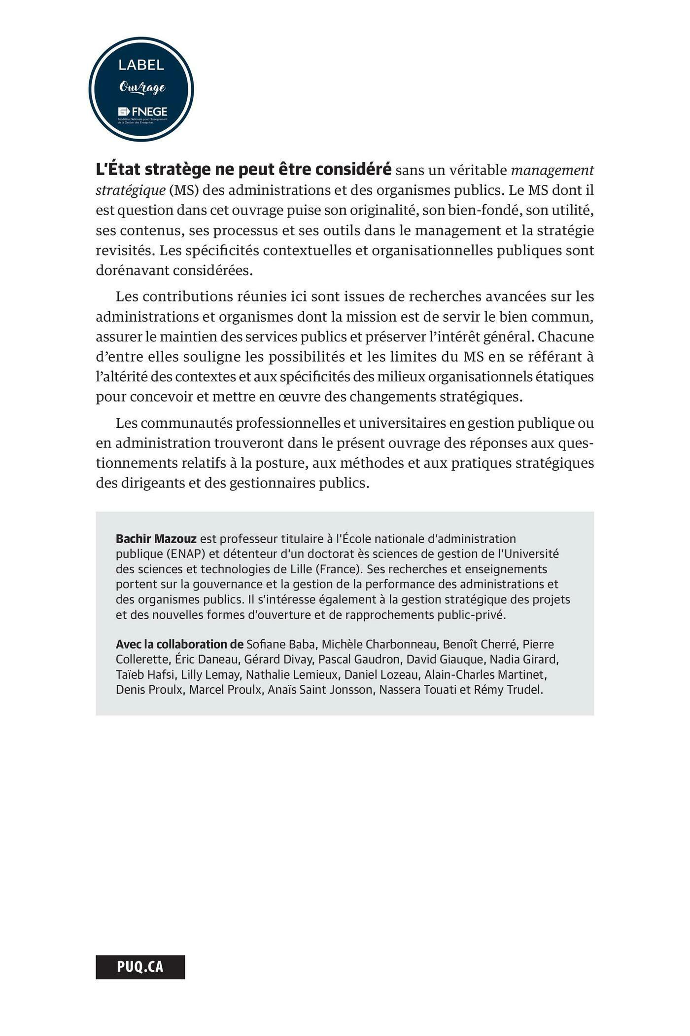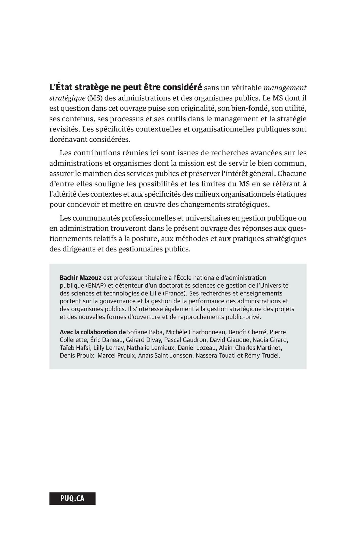 Les communautés professionnelles et universitaires en gestion publique ou en administration trouveront dans le présent ouvrage des réponses aux questionnements relatifs à la posture, aux méthodes et aux pratiques stratégiques des dirigeants et des gestionnaires publics.