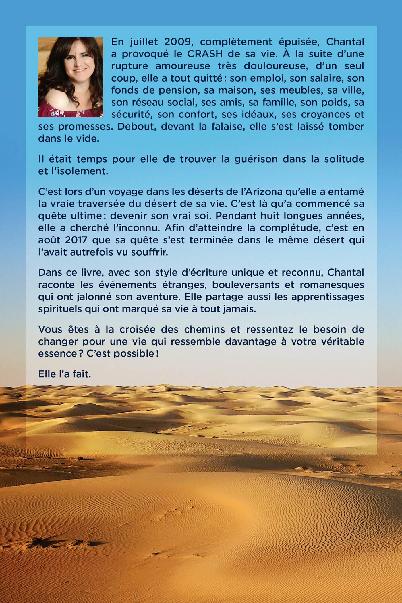 En juillet 2009, complètement épuisée, Chantal a provoqué le CRASH de sa vie. À la suite d'une rupture amoureuse très douloureuse, d'un seul coup, elle a tout quitté : son emploi, son salaire, son fonds de pension, sa maison, ses meubles, sa ville, son réseau social, ses amis, sa famille, son poids, sa sécurité, son confort, ses idéaux, ses croyances et ses promesses. Debout, devant la falaise, elle s’est laissé tomber dans le vide.Il était temps pour elle de trouver la guérison dans la solitude et l'isolement.C’est lors d’un voyage dans les déserts de l'Arizona qu’elle a entamé la vraie traversée du désert de sa vie. C'est là qu’a commencé sa quête ultime : devenir son vrai soi. Pendant huit longues années, elle a cherché l’inconnu. Afin d’atteindre la complétude, c’est en août 2017 que sa quête s’est terminée dans le même désert qui l’avait autrefois vu souffrir.Dans ce livre, avec son style d’écriture unique et reconnu, Chantal raconte les événements étranges, bouleversants et romanesques qui ont jalonné son aventure. Elle partage aussi les apprentissages spirituels qui ont marqué sa vie à tout jamais.Vous êtes à la croisée des chemins et ressentez le besoin de changer pour une vie qui ressemble davantage à votre véritable essence? C’est possible!Elle l’a fait.