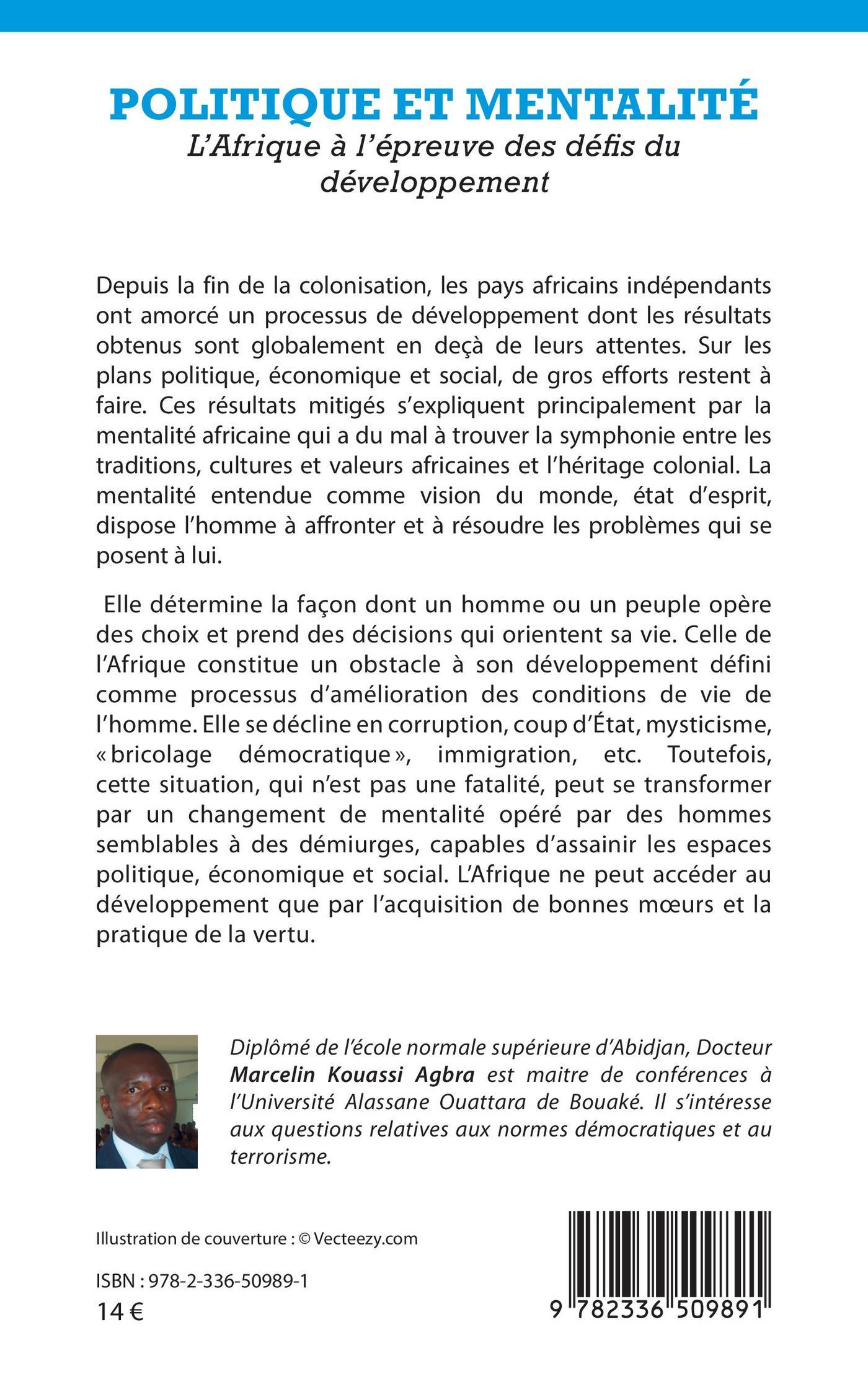 Elle détermine la façon dont un homme ou un peuple opère des choix et prend des décisions qui orientent sa vie. Celle de l’Afrique constitue un obstacle à son développement, défini comme un processus d’amélioration des conditions de vie de l’homme. Elle se décline en corruption, coups d’État, mysticisme, « bricolage démocratique », immigration, etc. Toutefois, cette situation, qui n’est pas une fatalité, peut se transformer par un changement de mentalité opéré par des hommes semblables à des démiurges, capables d’assainir les espaces politique, économique et social. L’Afrique ne peut accéder au développement que par l’acquisition de bonnes mœurs et la pratique de la vertu.